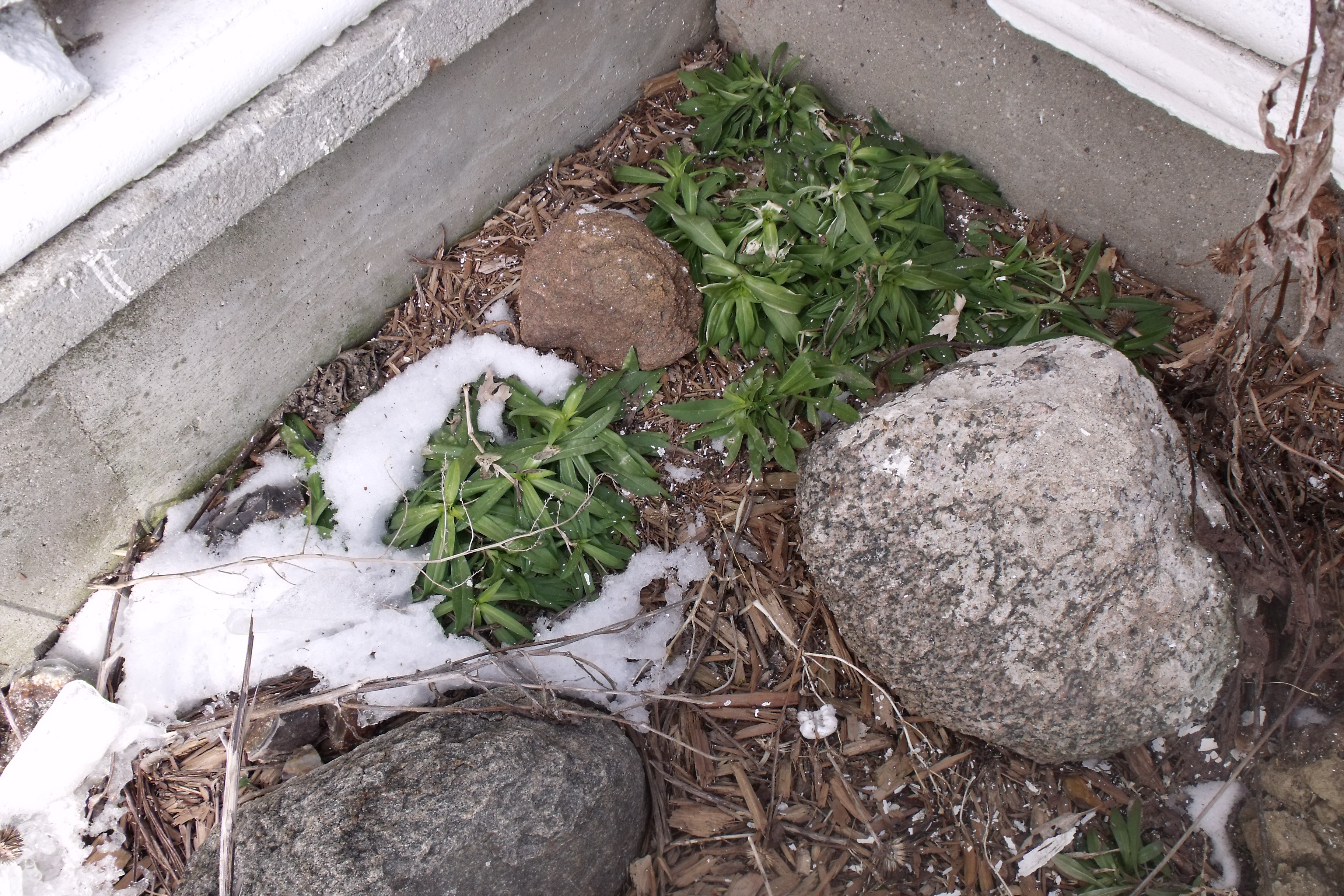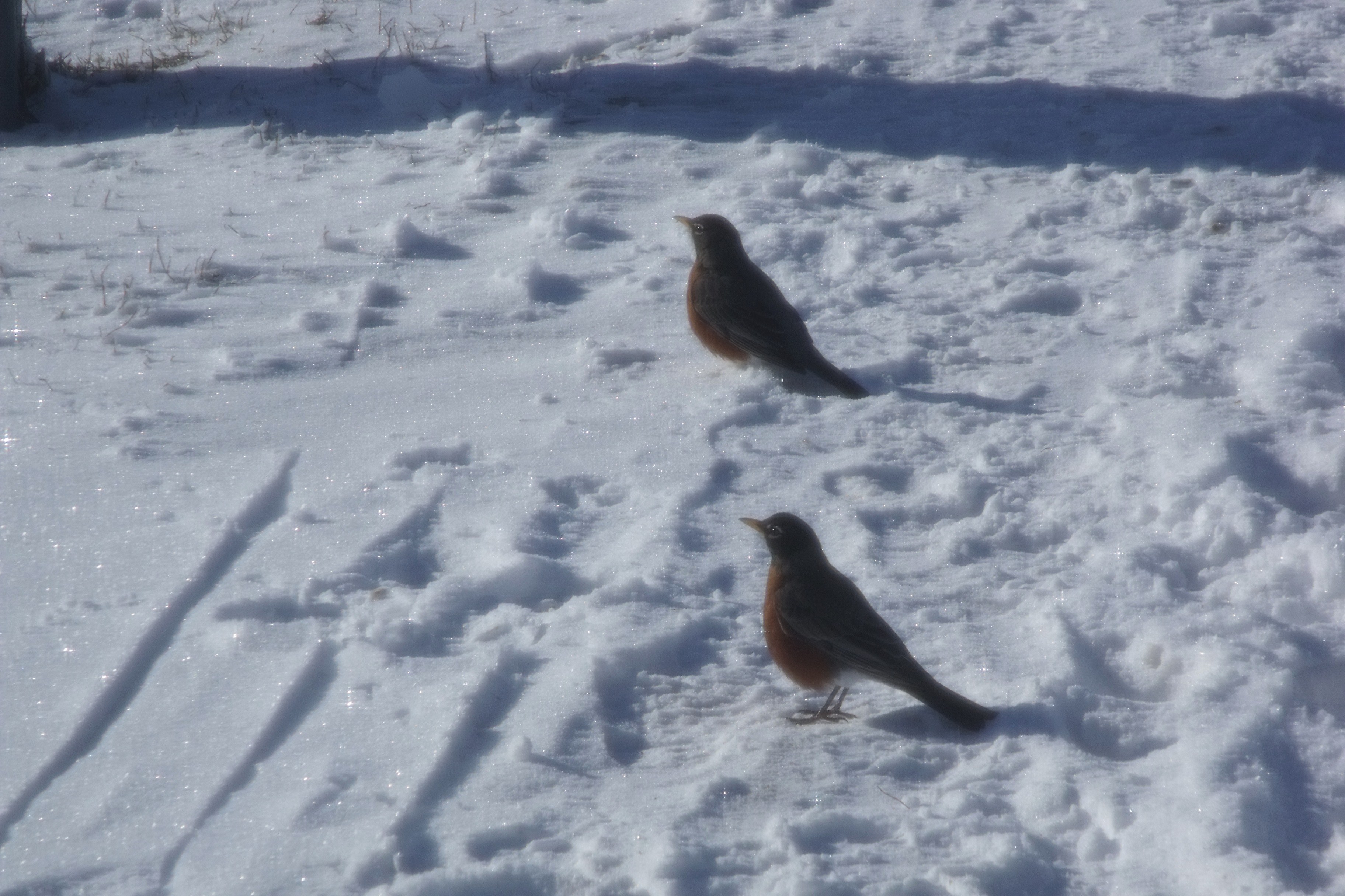 Today I went out searching for signs of Spring. I found Robins playing and I actually located a green plant that is sheltered near our porch, see below. The days are a lot longer and the location of the sun is just right for Spring time. I saw Clayton out working his horses only he was on snow and ice and not the usual mud. Two conflicting signs as springtime always has him working horses with plenty of wet mud flying. I also saw the kids doing chores bundled up just like they would dress in December and January! There were no bees out and about yet; they are very smart. The bee packages should be here in about 3 more weeks. Hard to believe when I look at all the snow. The sheep will be lambing very soon, so hopefully the weather will cooperate. Huge flocks of geese were spotted heading North, an early sign of warm weather coming.