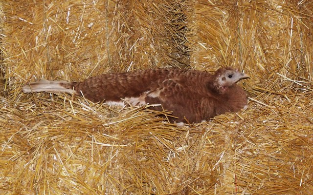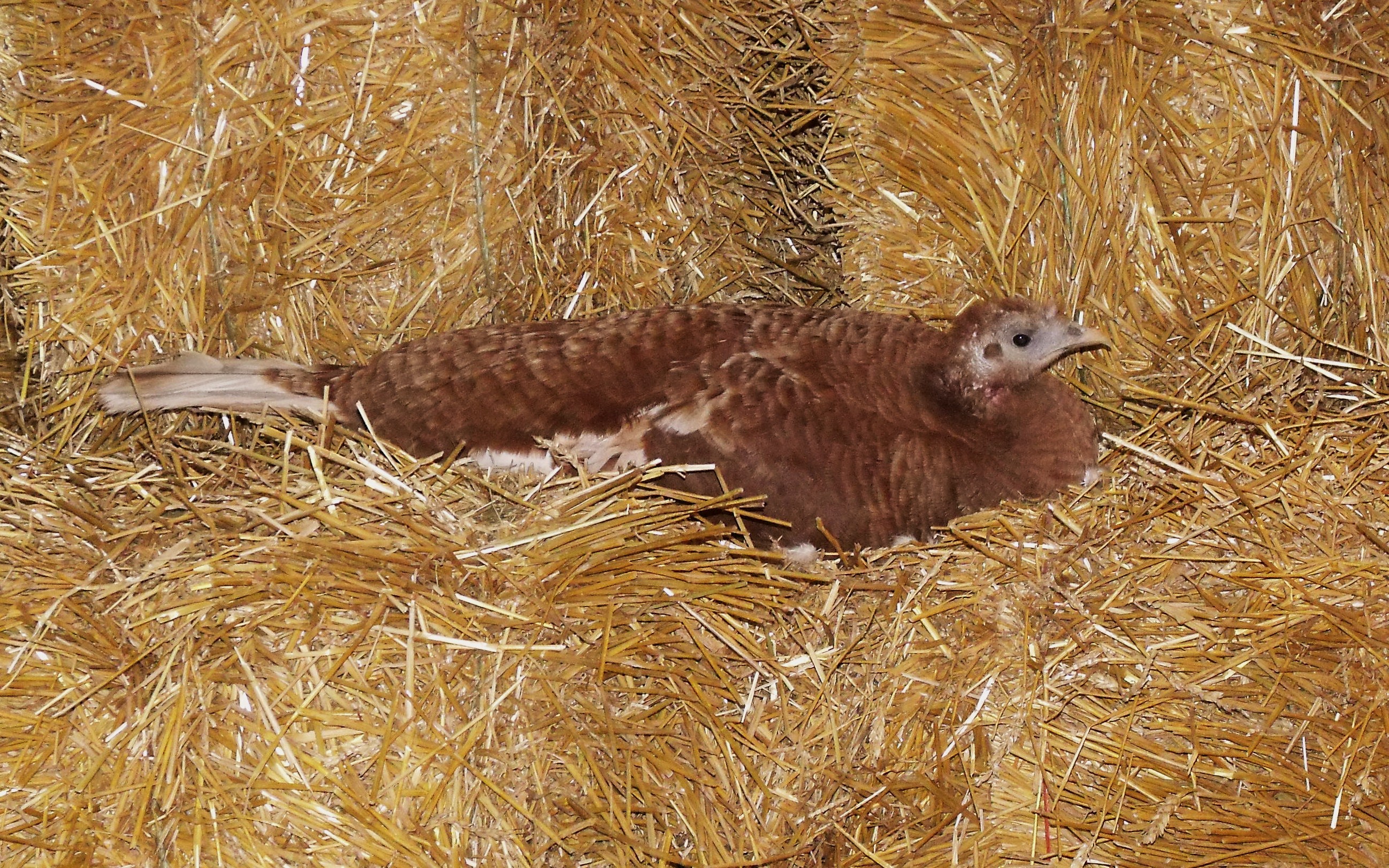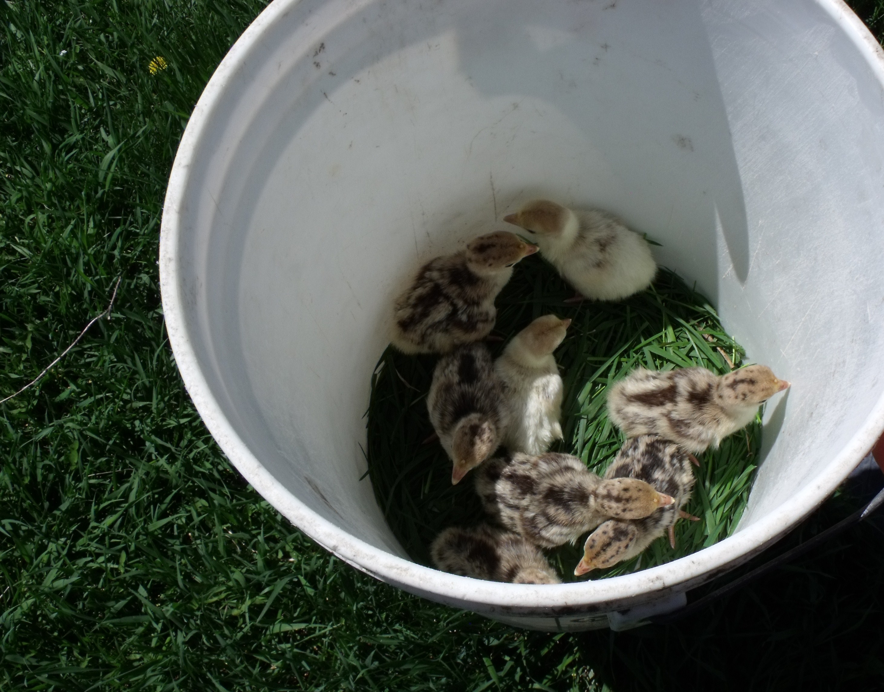 The turkeys are starting to have their poults and on Sunday the guys spotted a hen and her 8 babies, which sent us on an adventure of trying to catch the poults.  She was fairly calm and we were able to gather them gently into a pail and moved them to a pen where they will be safe and well taken care of.  The turkey hens are not very motherly and tend to take their chicks off into tall, wet grass where the poults become an easy target for our many farm cats, so we made it a practice of taking over her job and feeding them special gourmet food, hard-boiled eggs!! Those eggs are the trick to keeping turkeys alive.  The children have informed me that there are 7 turkey hens laying on nests throughout the farm, one being in our strawberry bed.  Several are in the quonset, while others are in the long barn.