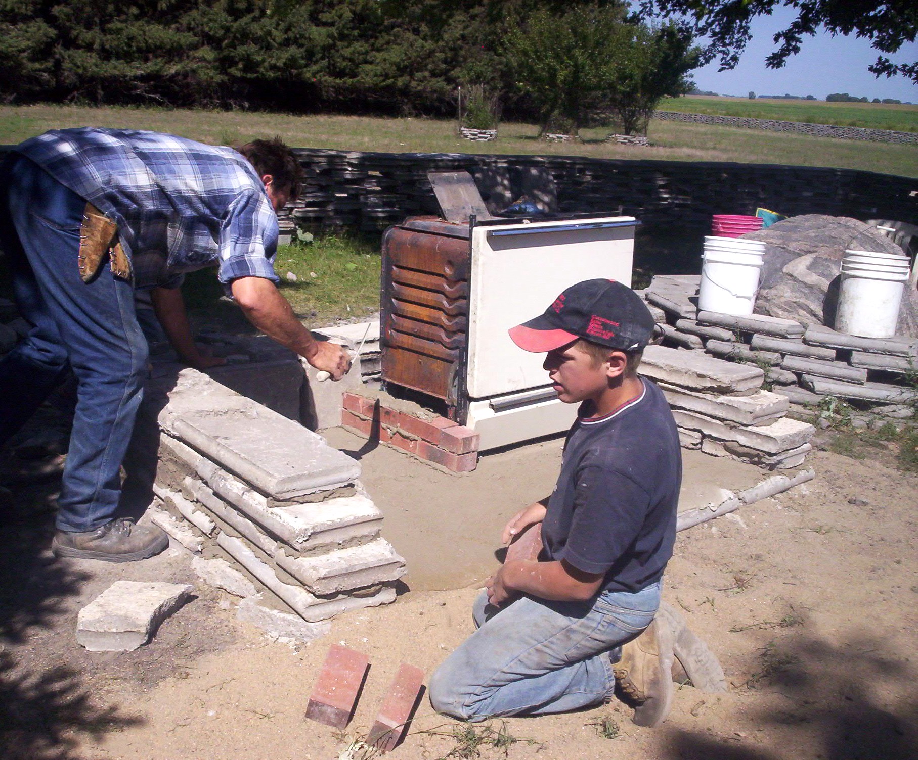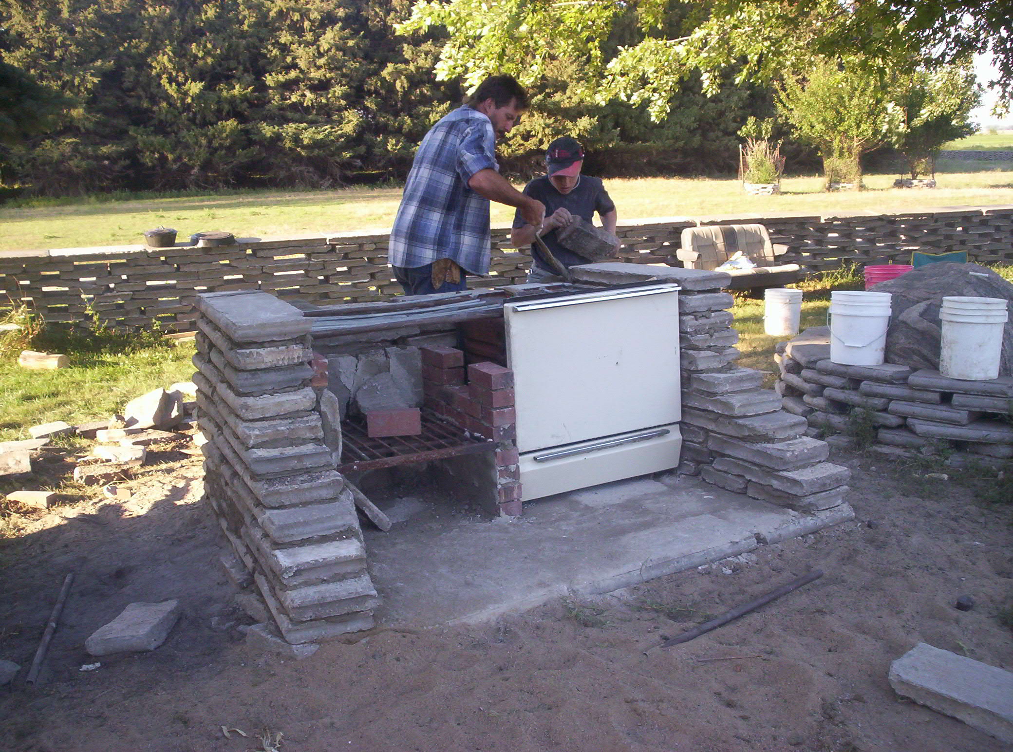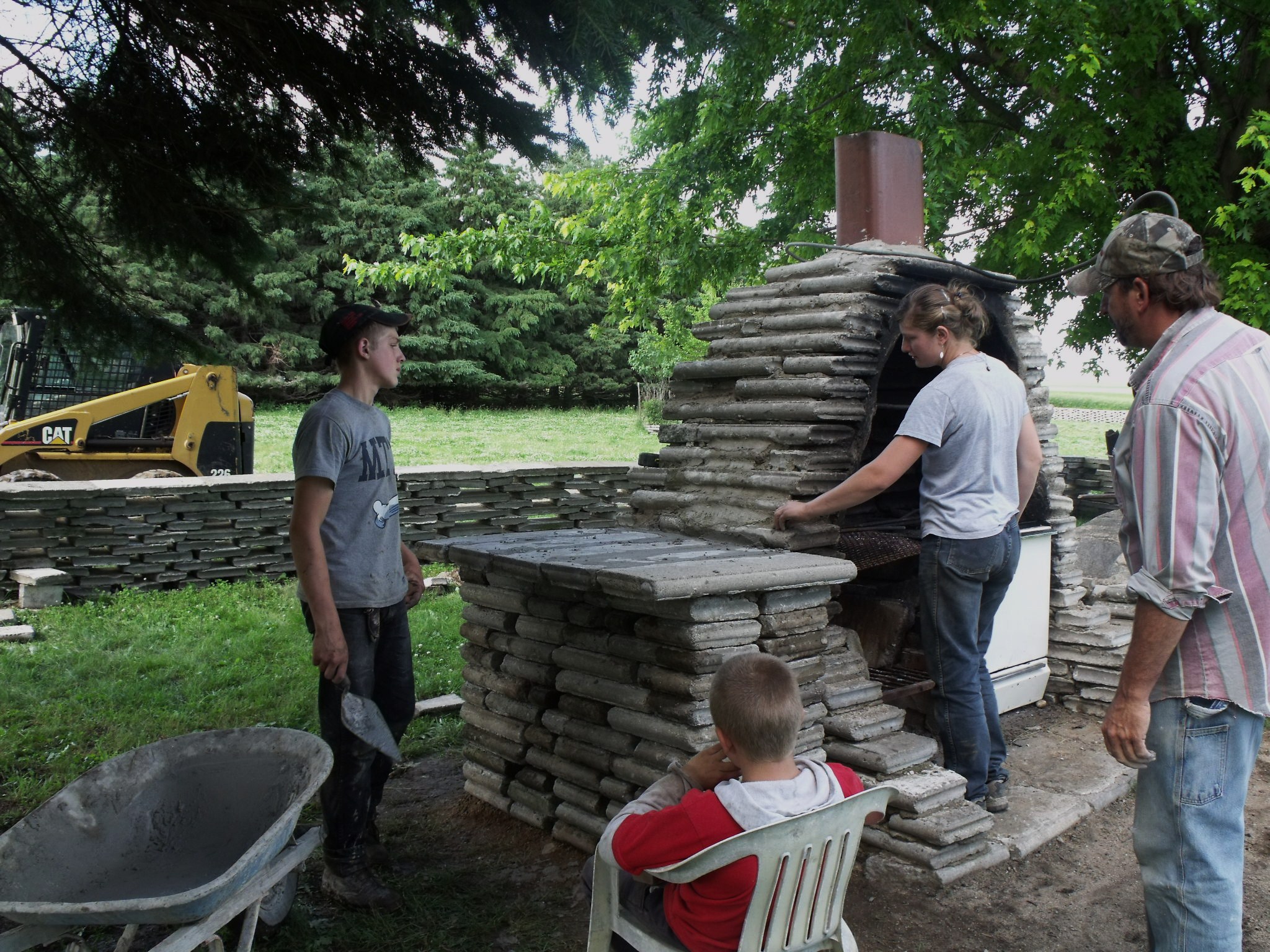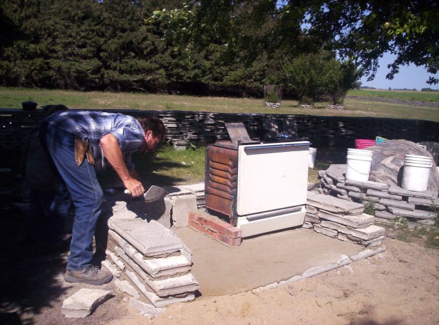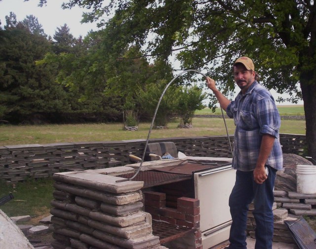He always finds a way to recycle things on our farm. For the pizza oven, he took an old gas stove of mine (we go through them often) and used that for the oven. He and Caleb mixed all of the cement one batch at a time. They used silo staves which we had plenty of, having taken down over 22 silos over several years. We also had some old bricks from who knows where, but they were sitting out behind the barn. I think the only cost that went into the project was that of a bag of cement. Even that was left over from some other odd project. He described to me in great detail how he would go about building this, but I had a hard time seeing what he had designed in his mind’s eye. I can never seem to visualize what he pictures in his mind so easily. The original fire-pit and pizza oven took around two days to complete.