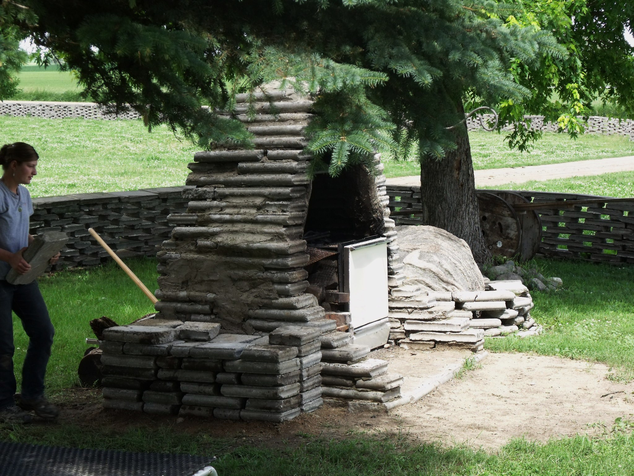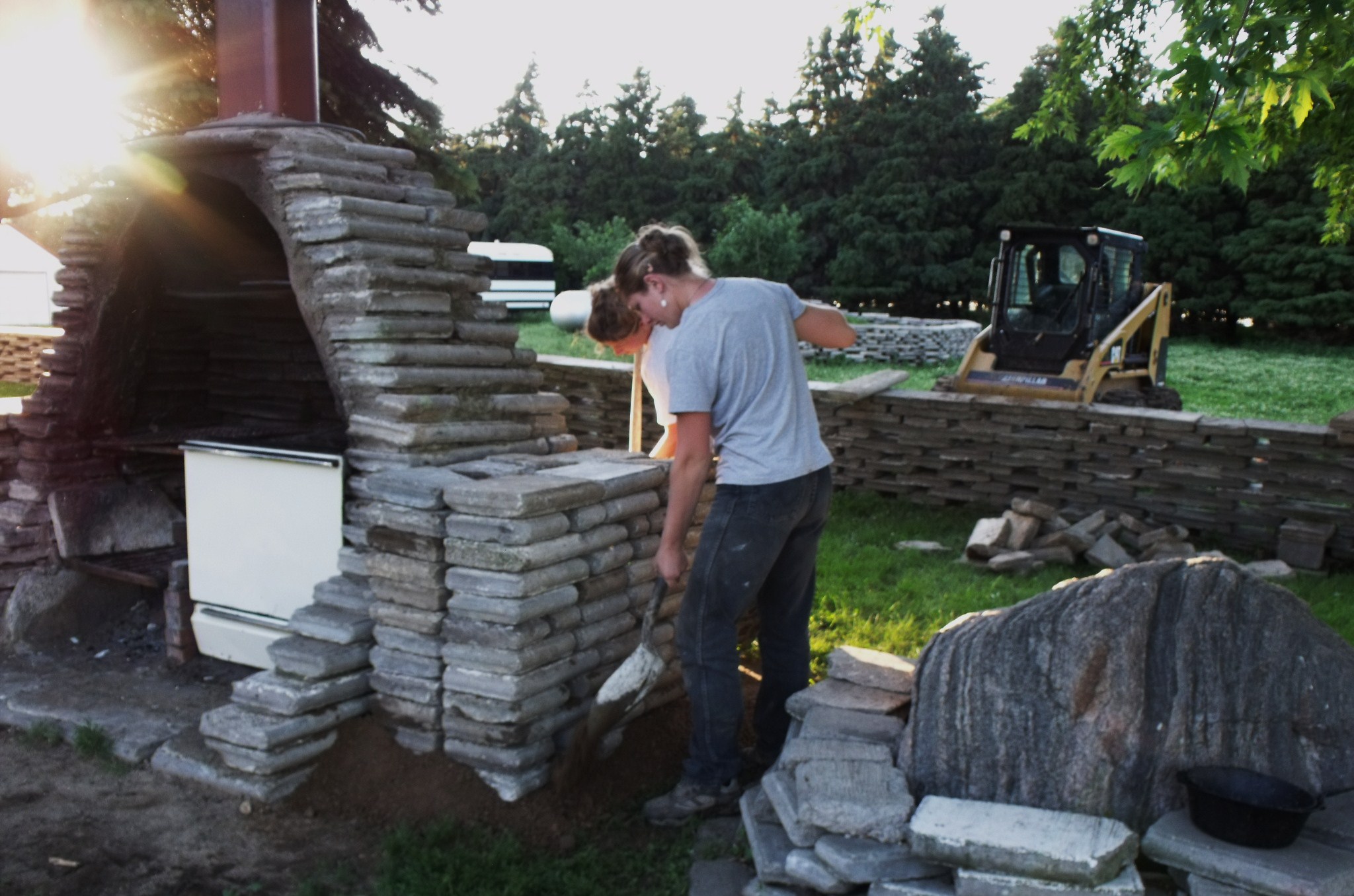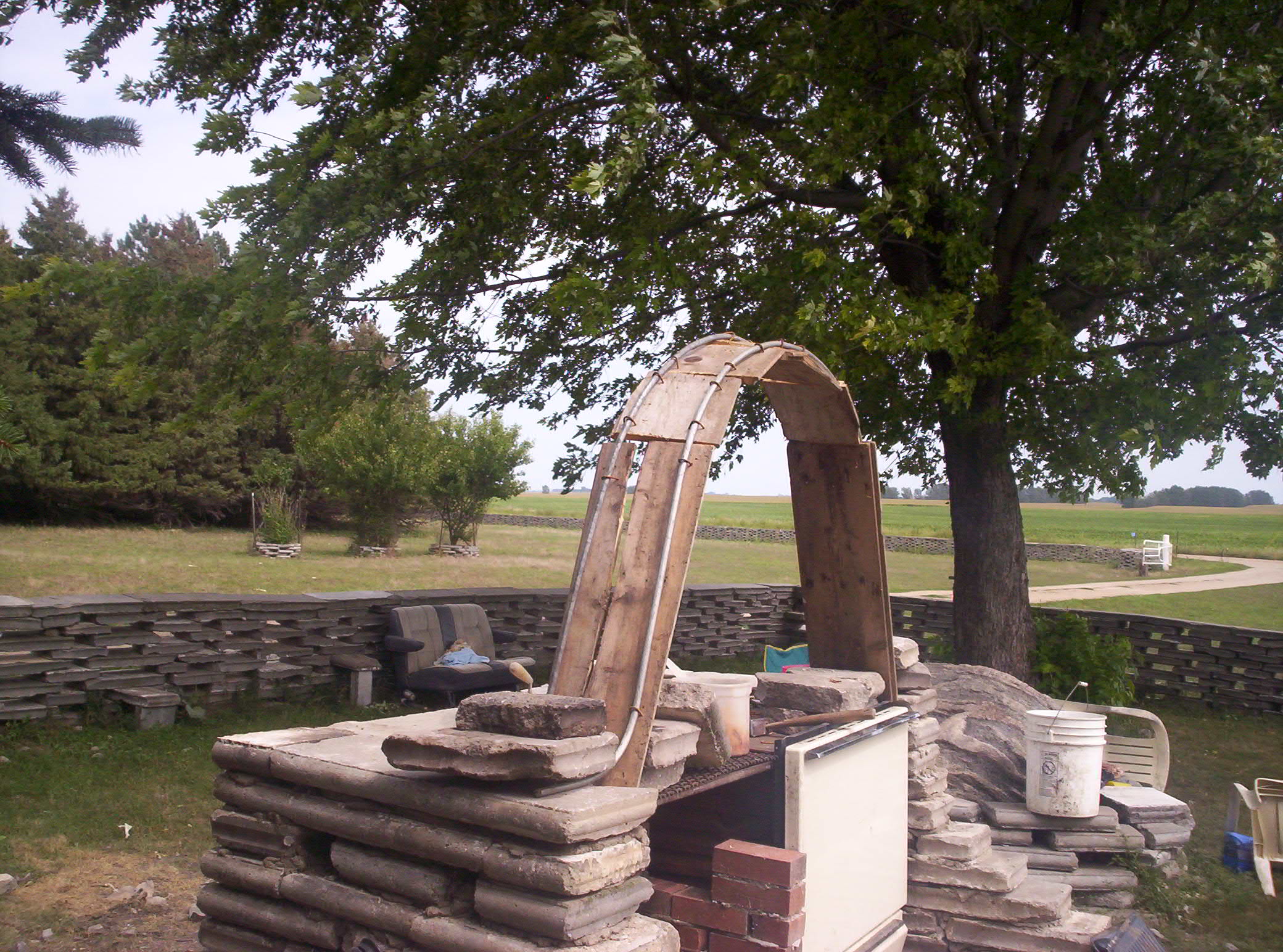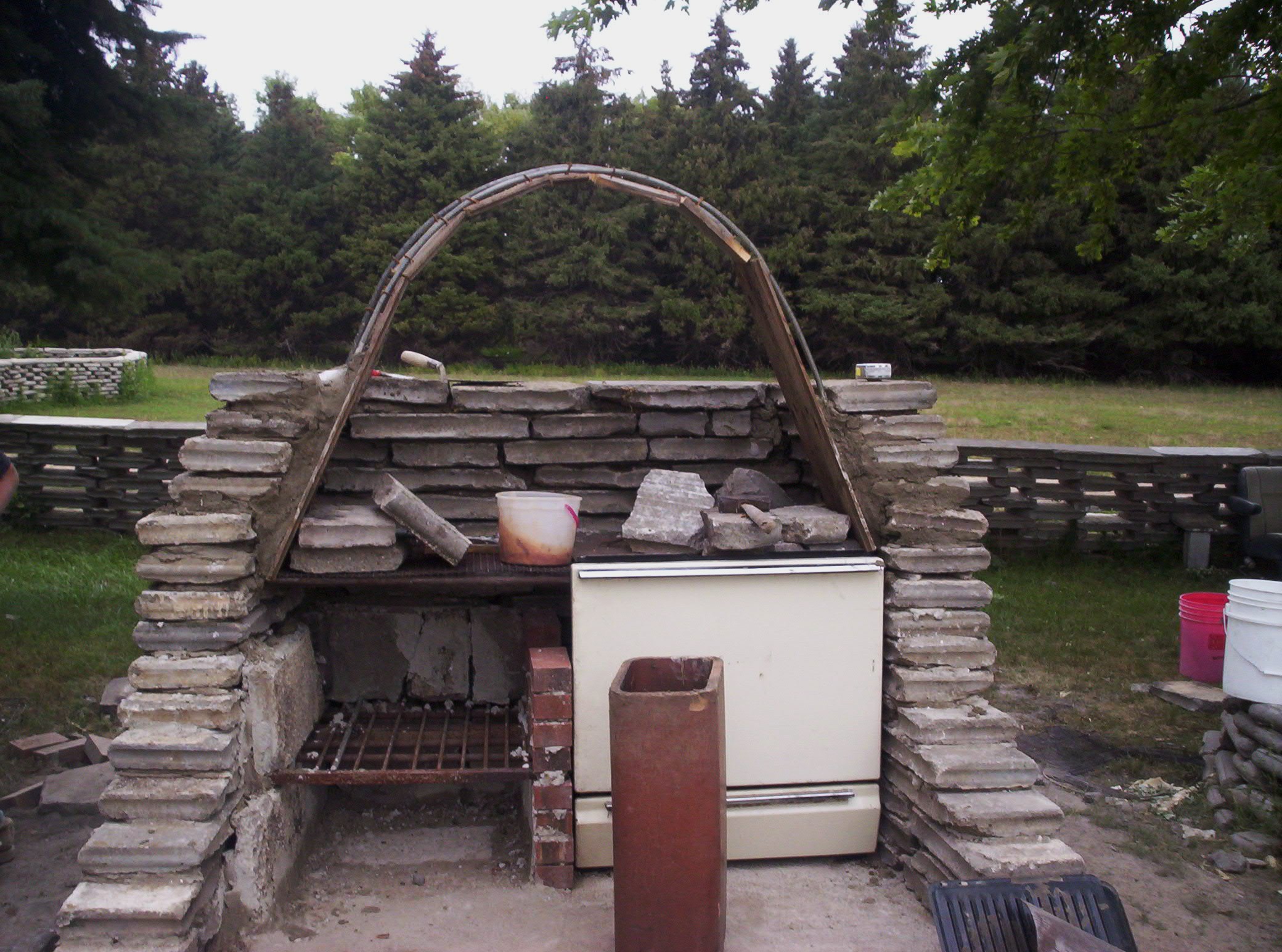 He always finds a way to recycle things on our farm. For the pizza oven, he took an old gas stove of mine (we go through them often) and used that for the oven. He and Caleb mixed all of the cement one batch at a time. They used silo staves which we had plenty of, having taken down over 22 silos over several years. We also had some old bricks from who knows where, but they were sitting out behind the barn. I think the only cost that went into the project was that of a bag of cement. Even that was left over from some other odd project. He described to me in great detail how he would go about building this, but I had a hard time seeing what he had designed in his mind’s eye. I can never seem to visualize what he pictures in his mind so easily. The original fire-pit and pizza oven took around two days to complete.