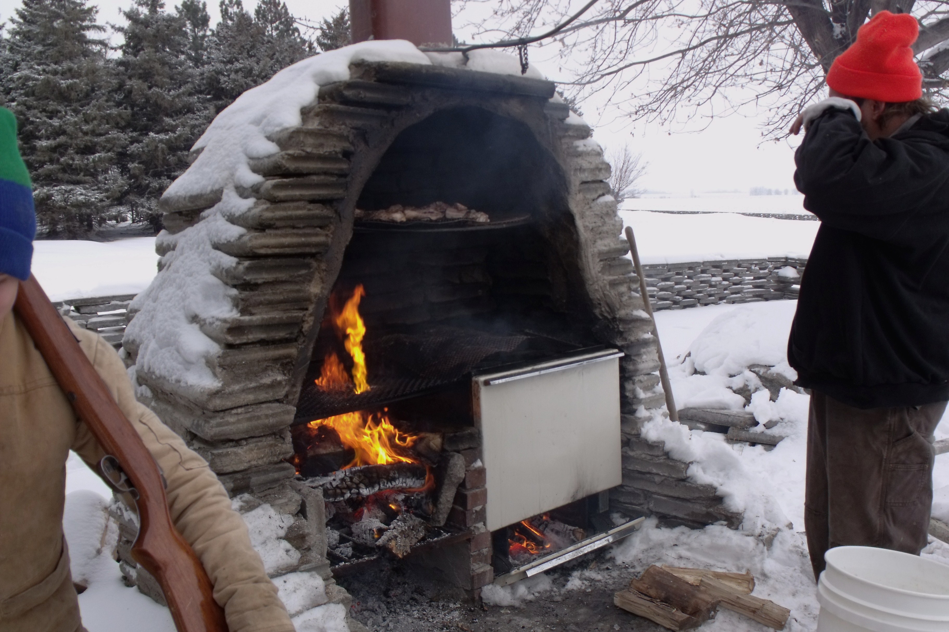 We also use the entire pit area for grilling, drying peppers, herbs and elderberries, rendering lard, cooking deep-fried onion rings, donuts and “pizza frit”, which is italian fried dough, a specialty my mom taught me to make. We also use it to smoke bacon and ham, render down bees-wax, bake pies, donuts and Stromboli. Otherwise, it is a great gathering place for bonfires, Rosaries and heart to heart discussions over a bottle of home-made wine or more recently home-brewed beer.