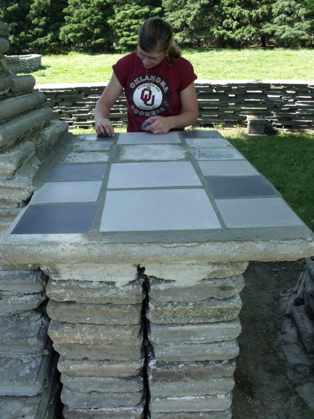 The photos below show the addition to the pizza oven/fire pit area that were completed a couple of weeks ago, all in one day. The Twins built up the side bars using silo staves. Then after that was completed, Fred taught them how to cement tiles on top to make it a nice area to work and serve food from. It has been fun using the bars or tables, call them what you like.