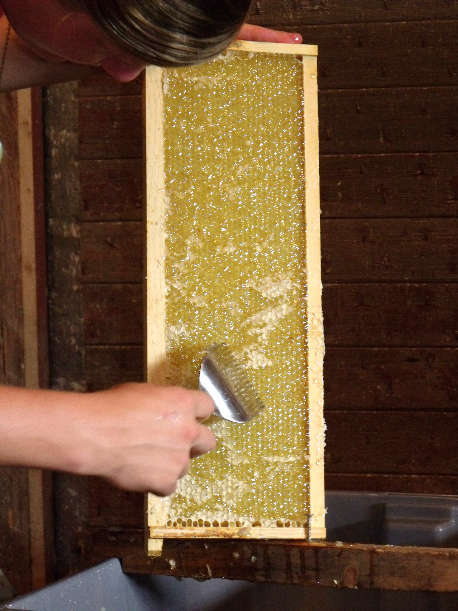 I took photos from start to finish of the process of extracting honey, which you can see below.  Hopefully, it will give those of you that don’t raise bees yet, a good idea of how it is done.  And to those who will be buying our honey, you can see how it was harvested, right here in Yellow Medicine County, Minnesota….USA.  Nothing added, guaranteed!  This was just a small sample and trial run, using our new facility.  The flavor of the honey is incredibly delicious.  Enjoy the photos!