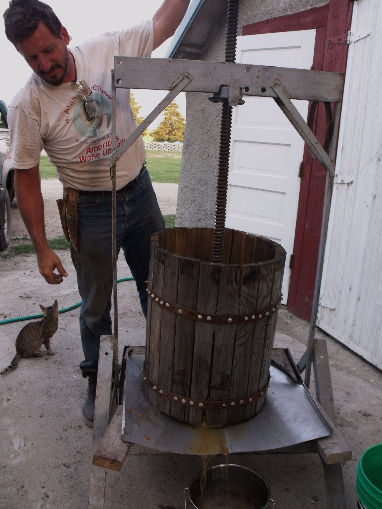 At first we were hand cutting the apples and putting them through our small meat grinder but that took forever. So after a bit of brainstorming and a good meal, Fred came up with an idea which worked out great. He washed out our feed grinder very well and dumped the apples in it to be chopped. The five gallon pails of apples that were dropped into the grinder were crushed intantly and I bet our red neck method could go down in the record book as the fastest apple grinding system in the state:) It worked so quickly; we were all amazed. The grinder was hooked up to the tractor, PTO driven. Because we were all working I did not get a photo of that particular procedure.