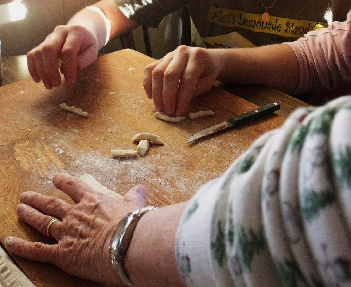 Well, recently mom decided it was time for the girls and I to learn how to make Cavatelli by hand. In Italy, she said, you are not ready to become married, if you can’t make two-finger Cavatelli. The potential mother-in-law wants to know whether or not her daughter-in-law to be can make Cavatelli. I had to laugh at that since I am now married 26 years without having mastered that skill:)
