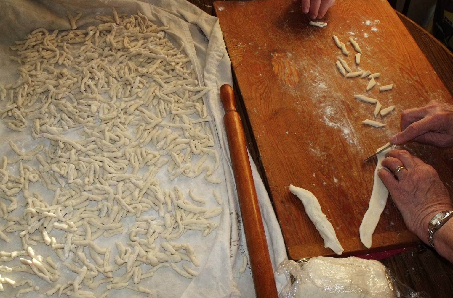 I pulled up on YouTube, to see first hand, how they make Cavatelli and then we decided to try it that night for supper. It was fun to make but it took way too long, even with 4 of us doing the work. In the end the kids had to milk cows so mom and I finished up the pasta. Nonna was not that pleased with how they looked before we cooked them, so when everyone loved them, I think she was surprised. Around here, I keep telling her nothing goes to waste. I should note that if you want to know how many cups of flour you need for your particular family size you can figure around 1 cup of flour per person.