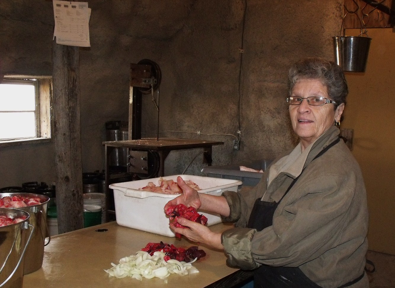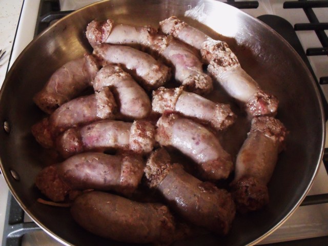 Nonna wanted to make Italian sausage so we phoned my Aunt Lillia back in Rockville, Md for the recipe.  It was pretty easy and tasted exactly like it did when we used to buy it at Ehrlich’s Market back in East Stroudsburg, PA.  Basically, we put fresh ground pepper and  plain old salt into the ground pork sausage.  No seeds of any kind were added!!  The salt amount used was a teaspoon per pound and the black pepper added was 13 tsp. for 15 pounds of meat.  We cooked some on the wood stove to make sure of the right amounts of seasoning and it was very delicious, so we went ahead and stuffed the links.