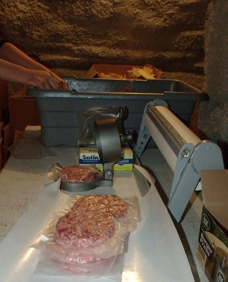 A favorite fast food around here are the ready-made sausage patties and we made 15 pounds of these.  They are very easy to make with a small press and the plastic sheets that go in between the patties.  These we did not season because, depending on whether they are eaten for breakfast or as a burger, the seasoning will change.