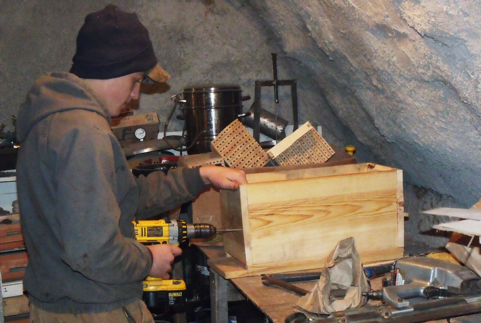 The colder winter days are useful for getting things done in doors.  Fred and Caleb have been busy building new bee boxes, nuc boxes, telescoping covers, inner covers and screened bottoms.  They used white pine and cedar as the wood source for these.  It takes a lot of time but in the end we will be able to increase our hive numbers slowly with not as much cash input.