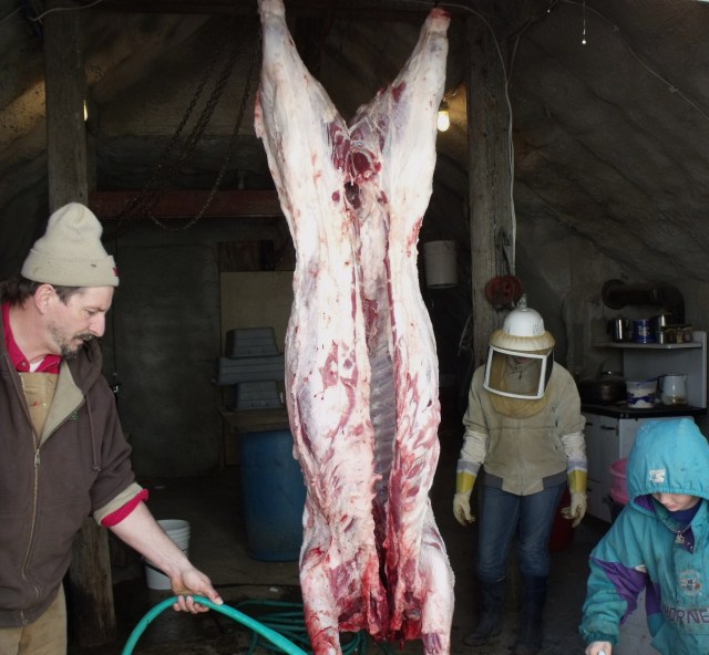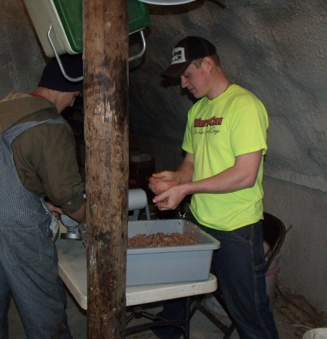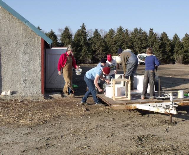 In between all the bee activities we butchered a hog on Tuesday and turned the entire animal into a variety of sausage. We made Sweet Italian bulk, Plain Italian bulk, Pepperoni bulk, Breakfast Sausage patties, Pepperoni Links, Plain Italian patties and Sweet Italian patties. Everyone was totally exhausted last night and some of us fell asleep during the rosary. Pretty sad eh? It’s the thought that counts though and there was much to be thankful for. We all slept very well, even Fred, who was none to thrilled to have to go into his “real” job today, another sign of Spring!
