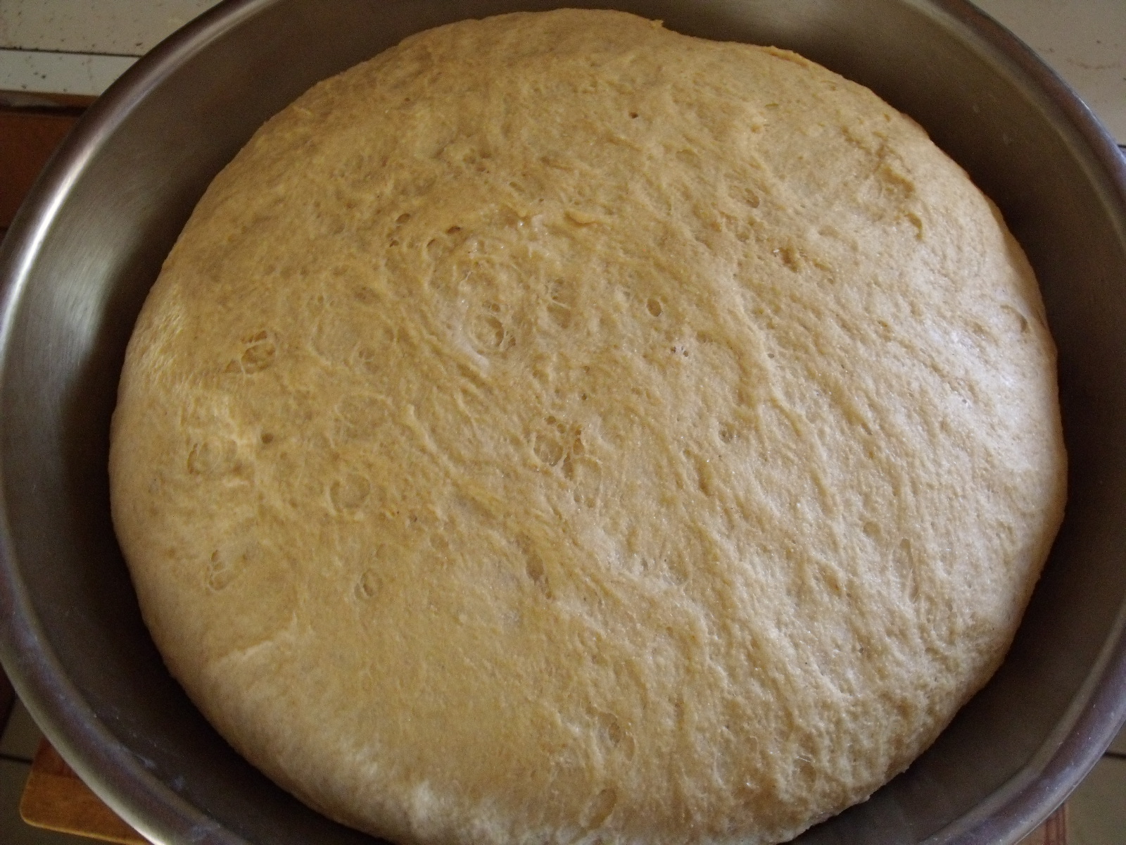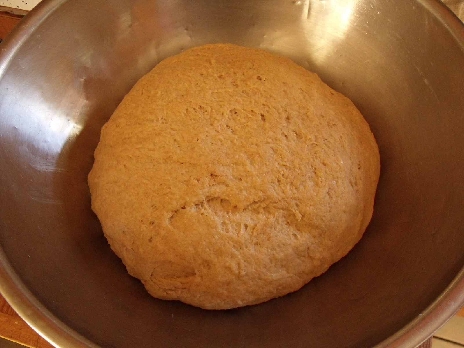 Whole Wheat Flour    (Mine used a 2# 2.5 oz. coffee can of wheat yesterday.  Approximately 12 cups, start with 10 and keep adding until the right consistency, even if you go over what I suggest.    This was a bit sticky on my hands as I kneaded and rolled it around, but don’t over do the flour or it will be dry.  Whole wheat breads always need to be handled differently than all white flour breads.)