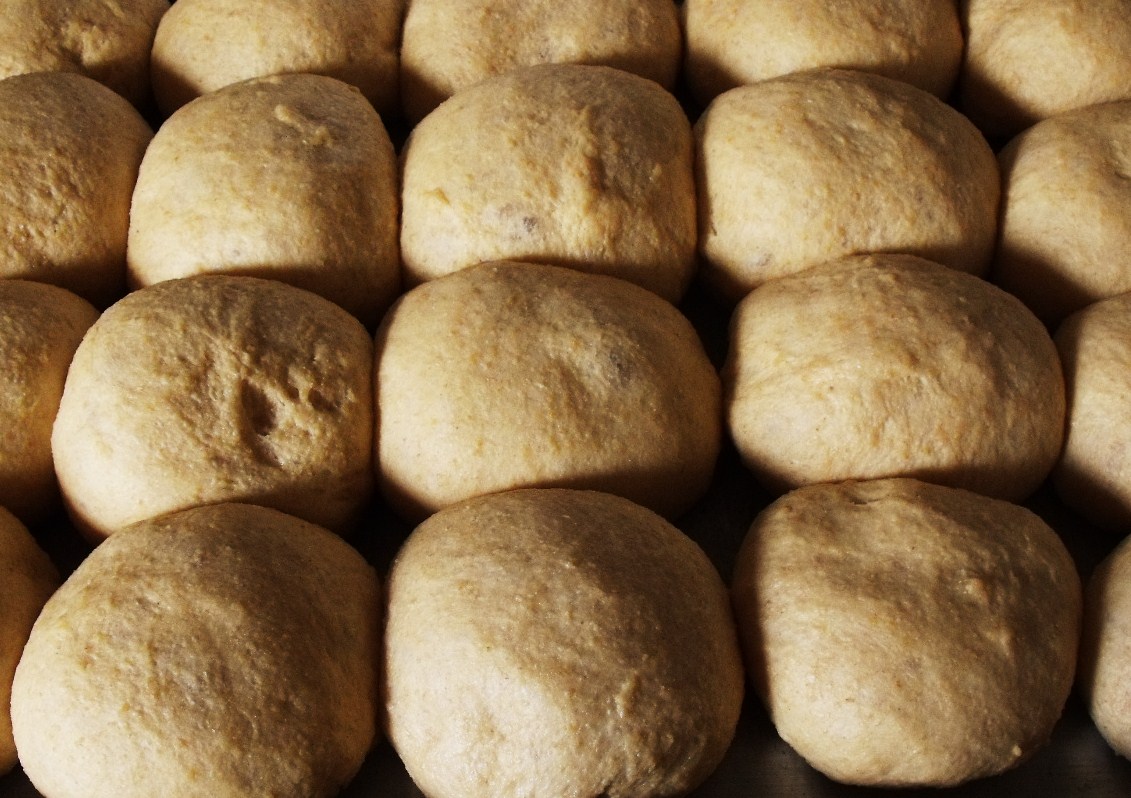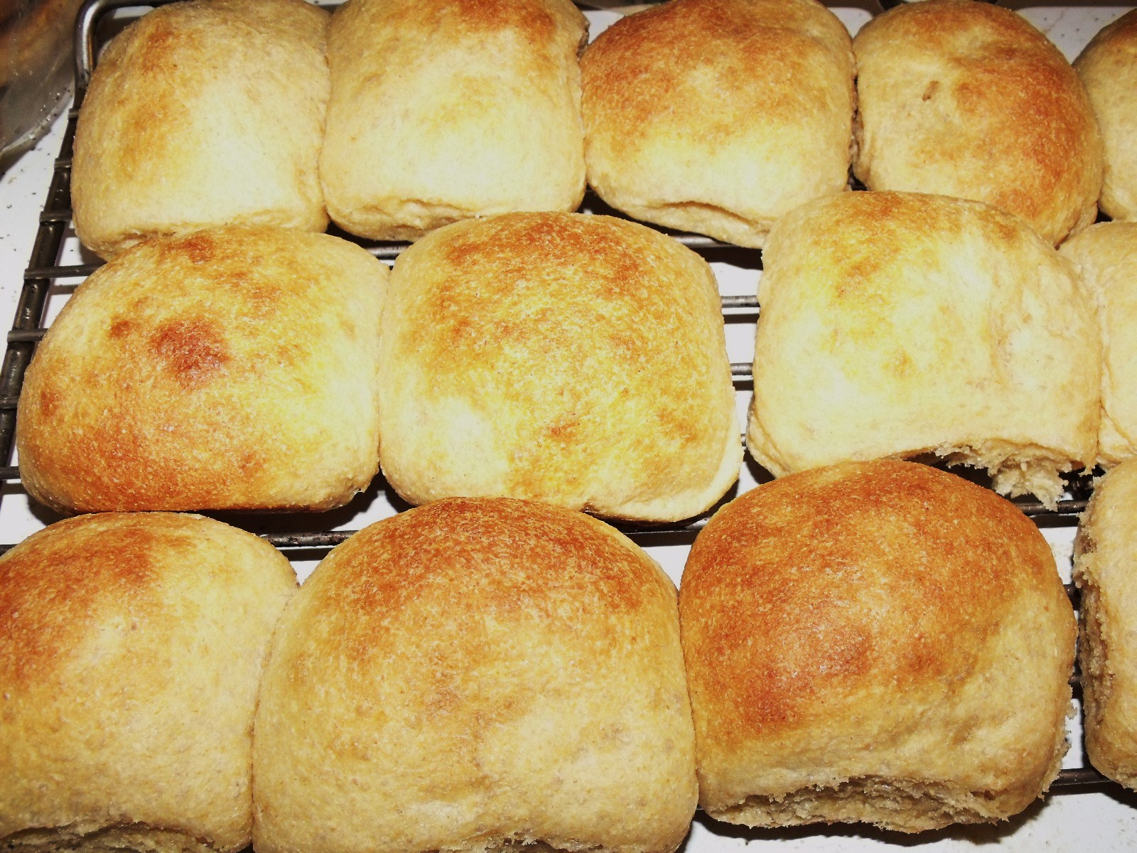 Grease your trays or bread pans and form into either bread loaves or buns.  I prefer buns.  Let them rise at least an hour, you judge……….then preheat the oven to 400 degrees and bake.  My buns take 15 min. until medium-brown color in my gas oven.  If you are going to bake this I assume you know how to judge your own oven:)  Pan loaves will take longer.  Just keep an eye and nose out.  This is well worth the effort.  This wheat bread is  soft and does not taste wheaty.