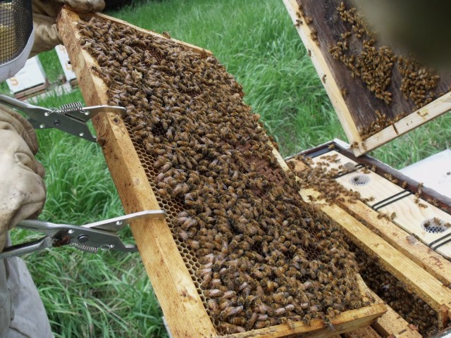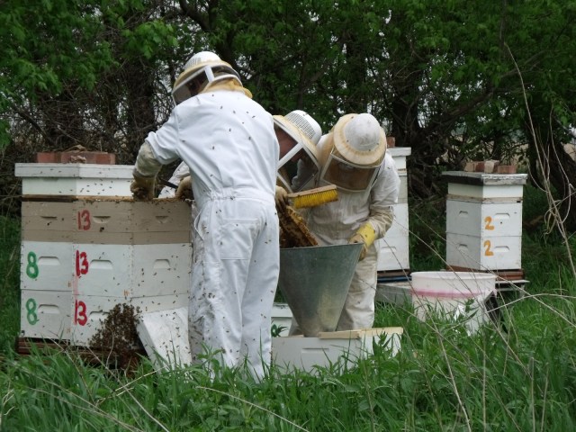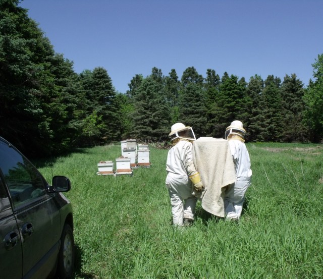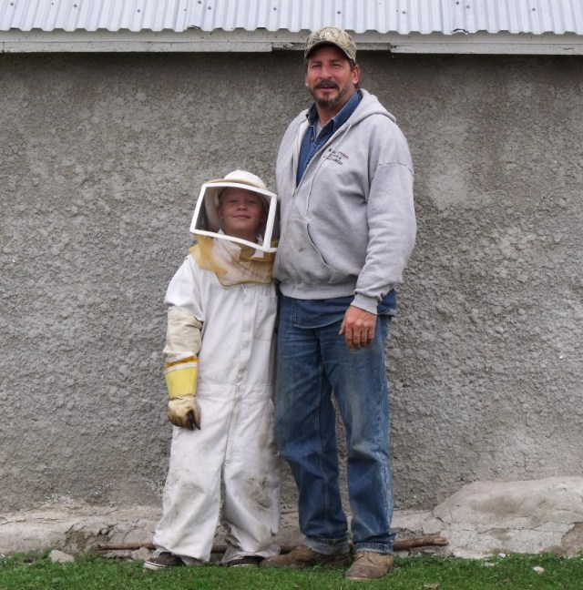 The attempt at queen rearing won’t be known as success or failure for some time, but if at first we don’t succeed, we will definitely try again. Soon we shall see! This year we did not purchase any new bee packages, hoping to save money, but we did invest in new queens that we added to the split hives. Fred built the new hive boxes and we ordered some beekeeping tools including a new suit for me. I really enjoy watching the bees right up close. They are absolutely amazing, especially when you are not afraid of getting stung. Mario has shown a great interest in the bees and went with us today, all suited up!