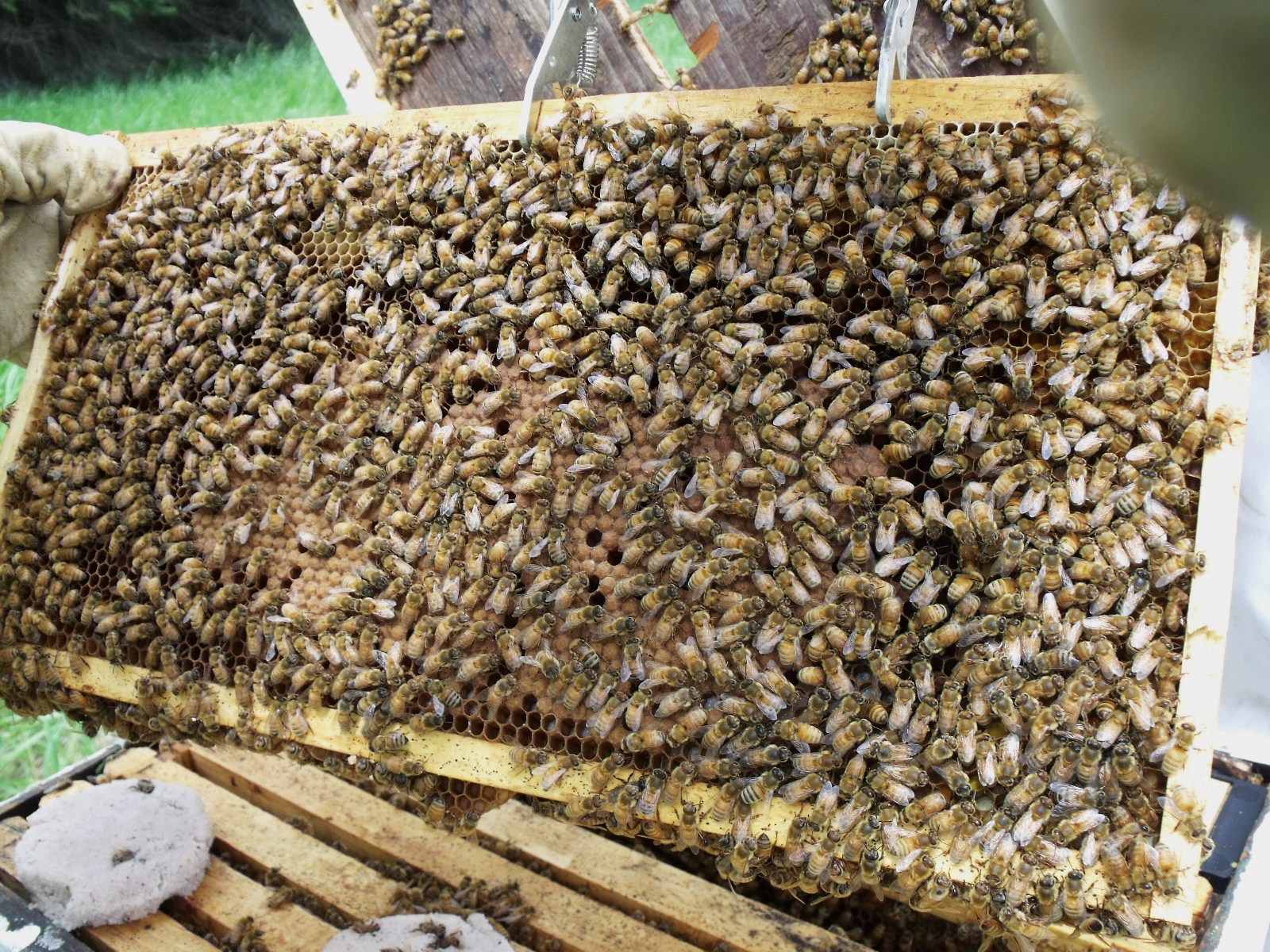 We had two of our hives swarm and the girls were able to make new hives of them. Swarming is a natural occurrence in an overcrowded colony. The original queen leaves the hive with half of the worker bees, leaving a queen cell (or cells ) to replace her. The bees take to the air and find a gathering place (usually wherever the queen decides to land) and wait there until their scout bees return with news of a new home location. It was beginners luck catching them since this was a new experience for us. One of the hives that swarmed had already been split! With such a mild winter the over wintered hives have done quite well, a real blessing in such a cold climate. The first swarm happened right here in our garden, the bees ending up almost at ground level in the cherry bush. The other was thirty feet high and took some doing to catch. Fred and Caleb to the rescue!