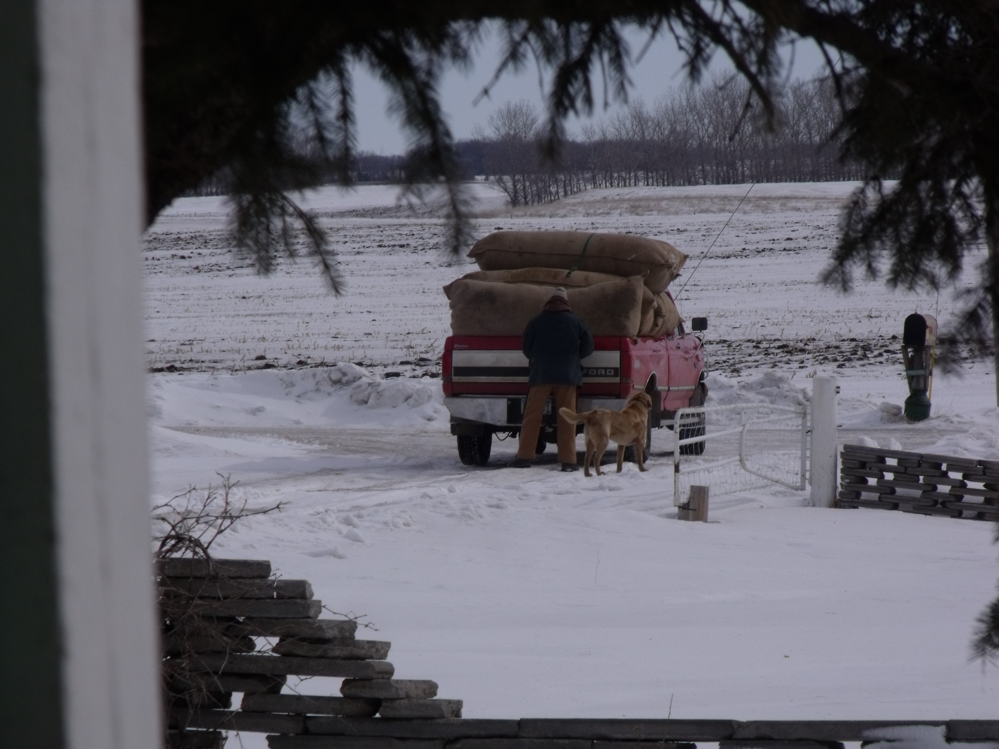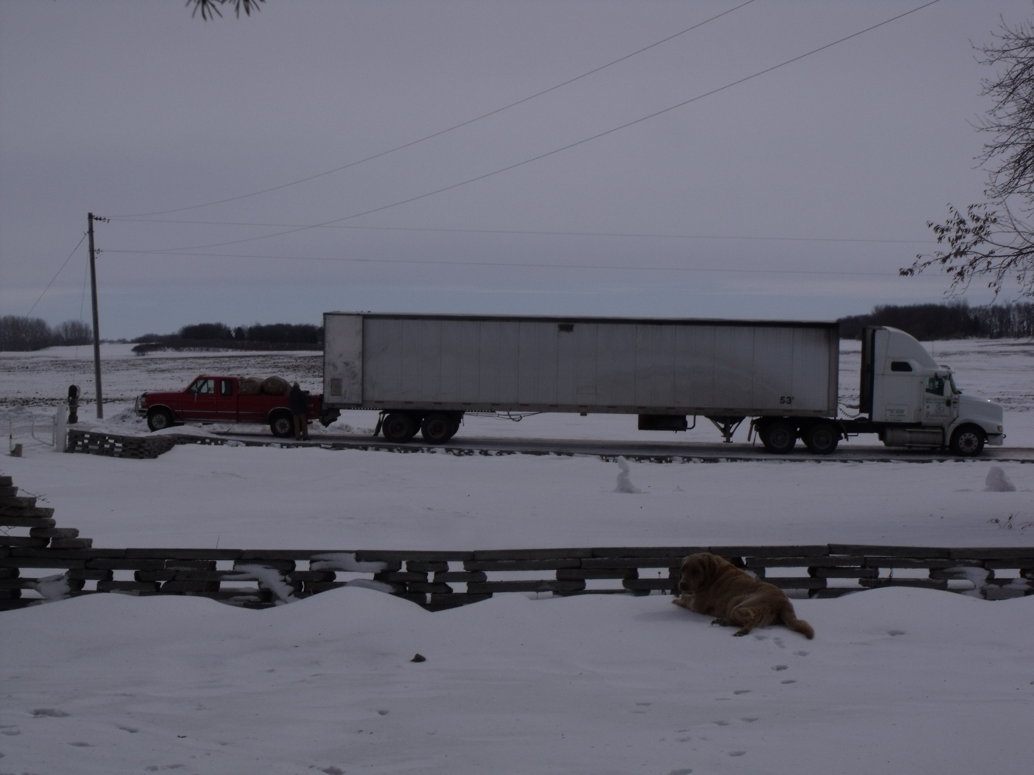 Our yard is full of thick slippery ice,  snow and deep ruts so Fred decided to meet the wool truck at the end of the driveway.  Luke was gone shearing and  we were smoking bacon when the truck arrived.  Caleb and Fred helped the Midstate Wool Grower driver load the semi with wool.
