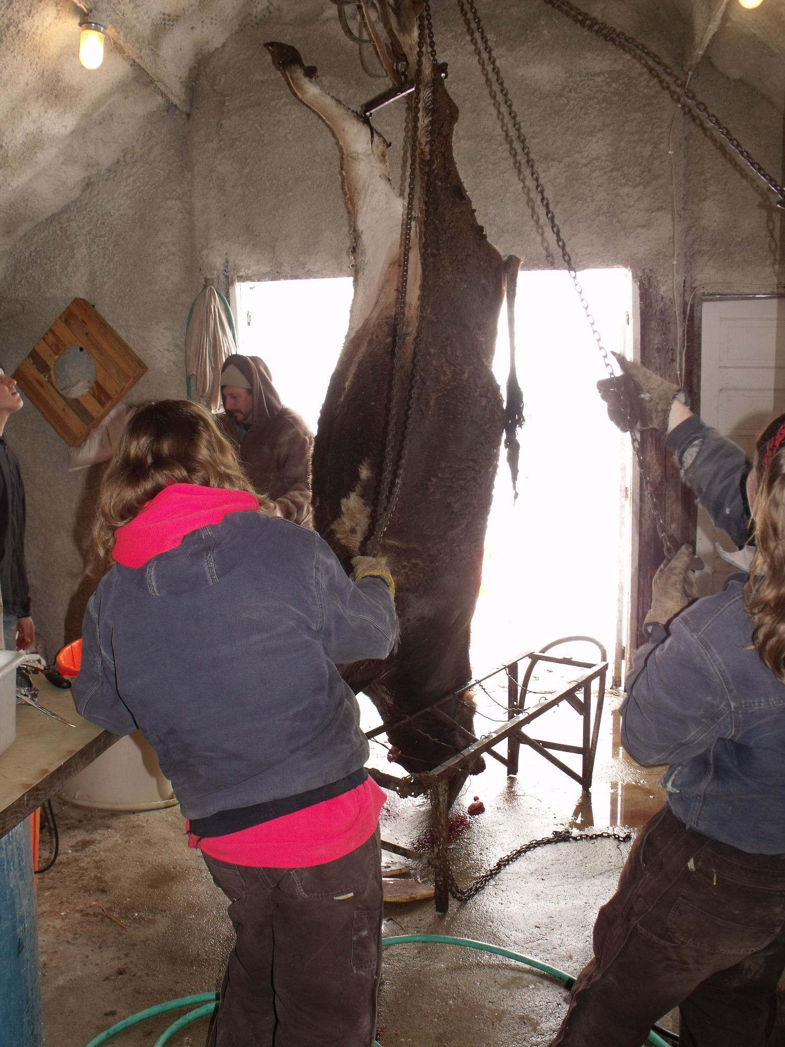 During yesterday’s snow we butchered a hog and a jersey beef. I’ll post some of the process soon. Right now the meat is hanging till this weekend in the butcher shop at which time we will cut, wrap and freeze. In the mean time we are still lambing and are not half way finished yet. Lambing is going great so far!