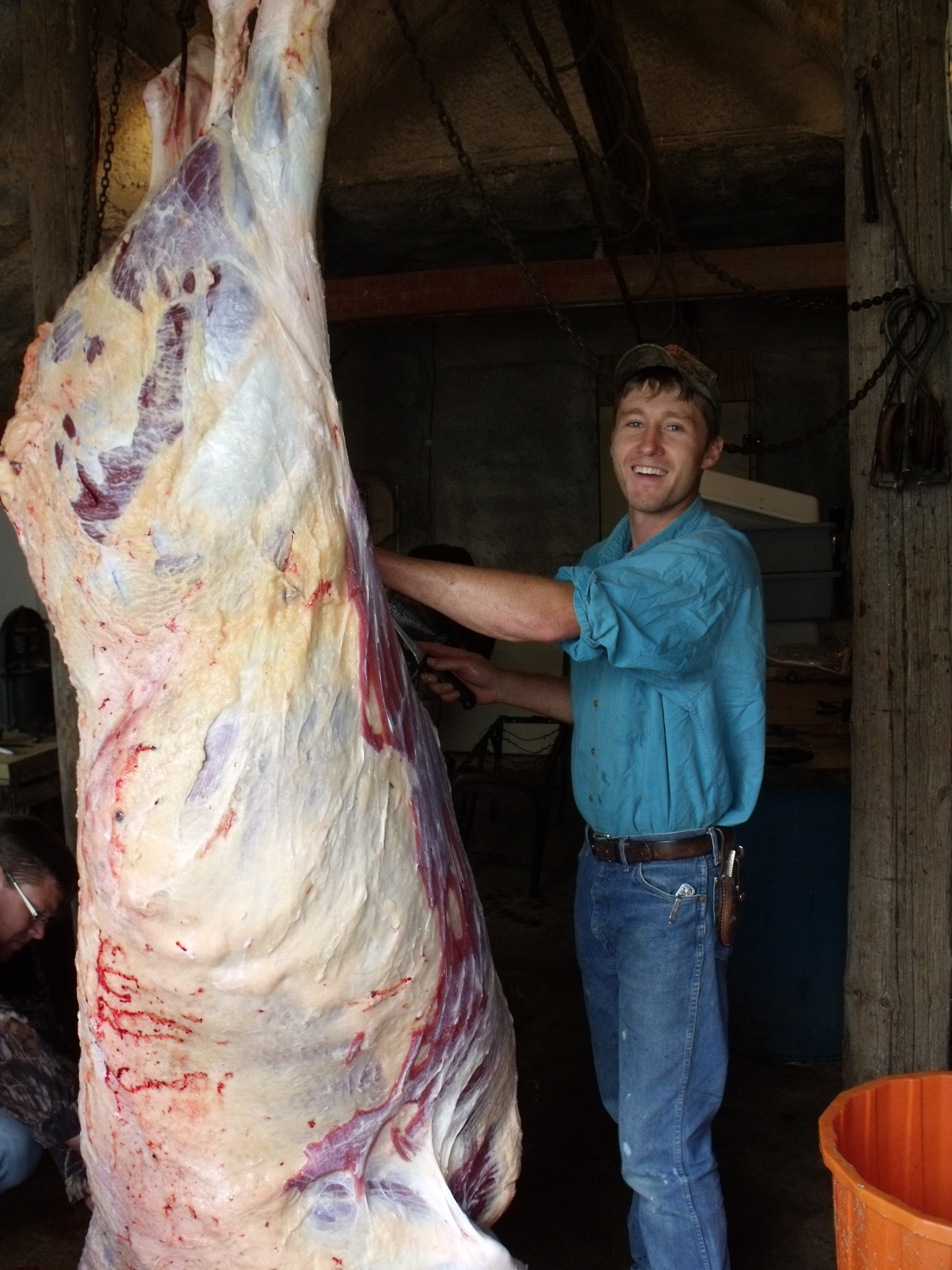 I should mention, we were busy packaging this Longhorn steer while we were testing the oven.  Caleb and I kept running over to test the stove while we were cutting and wrapping the steer.  Above is our son-in-law Luke Dougherty helping us out.  The steer belonged to a friend of ours and naturally we asked Luke to help since he’s done more cattle than we have.  I took this photo with his mom in mind and asked Luke to smile for her.  This is for you Beth.  Thanks for raising up such a wonderful country man for Jessi.