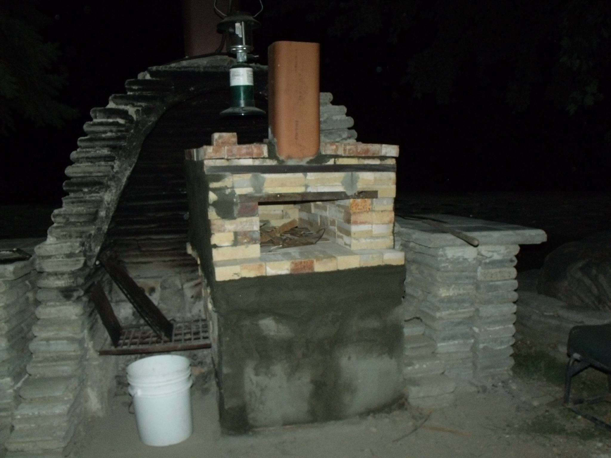 The other day I watched a video on YouTube of an outdoor pizza oven that was made without mortar or real fire bricks.  It was a portable oven.  So entertaining  was it, that I asked the boys to build me one.  One of our neighbors had helped us acquire a whole pickup load of real fire brick the day before!  I couldn’t believe how fast they assembled the new pizza oven.  It took two half days to complete.  We tried it out last night and we were very pleased with the pizza.  Almost sadly I have to admit I like it better than my old redneck pizza oven!  It’s a whole different ballgame learning to cook with a “real” pizza oven but the results were delicious.  The guys told me that it was no big deal if I don’t like it they will knock it over and start again……….so we will see how long I like it.  I took the photo of the oven above, in the dark, the next morning while the mortar was still wet.