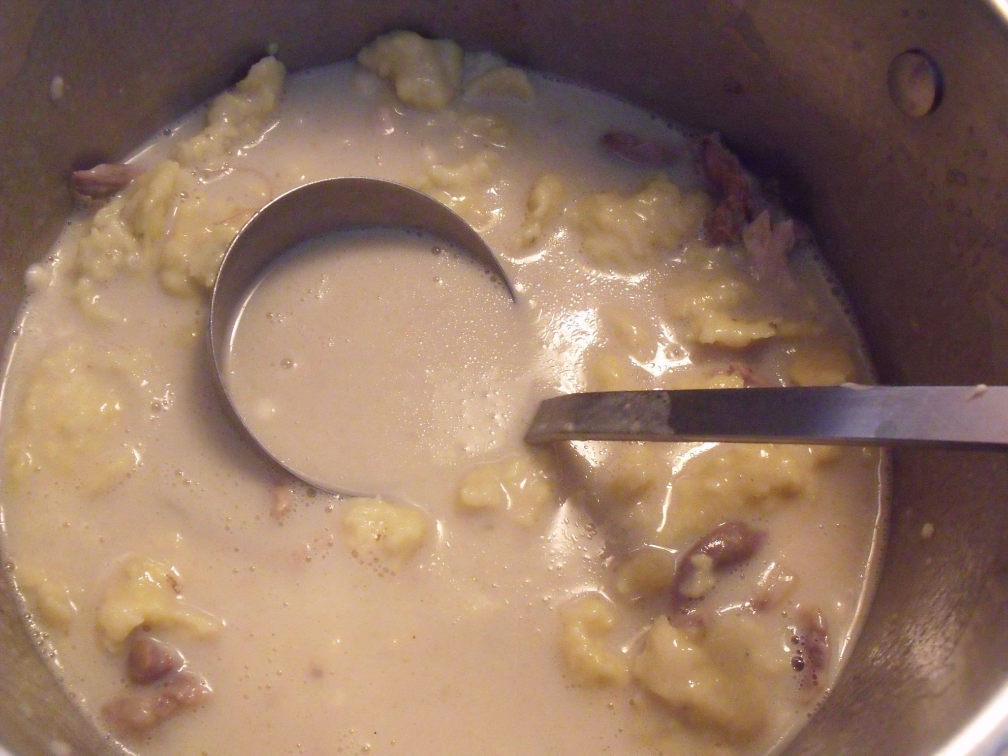 Homemade Egg Dumpling Potato soup with cream, butter, ham from our farm. The kids love dumplings and it’s a great way to use up eggs and extra milk! Boiling the dumplings takes time but is worth the effort.