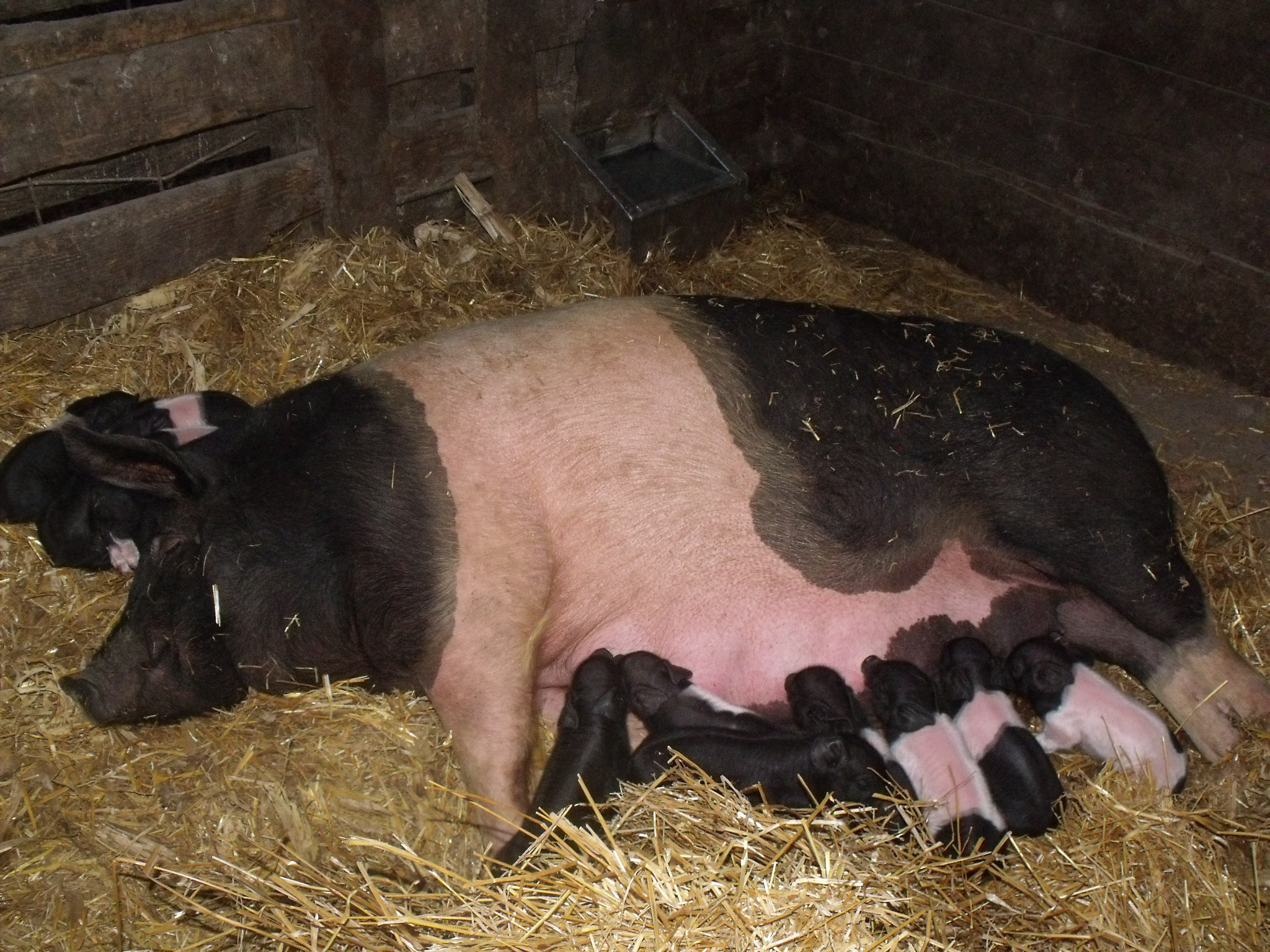 The sow in the next maternity pen had 9 babies, all of which are alive thanks to our “midwife”, Marisa.