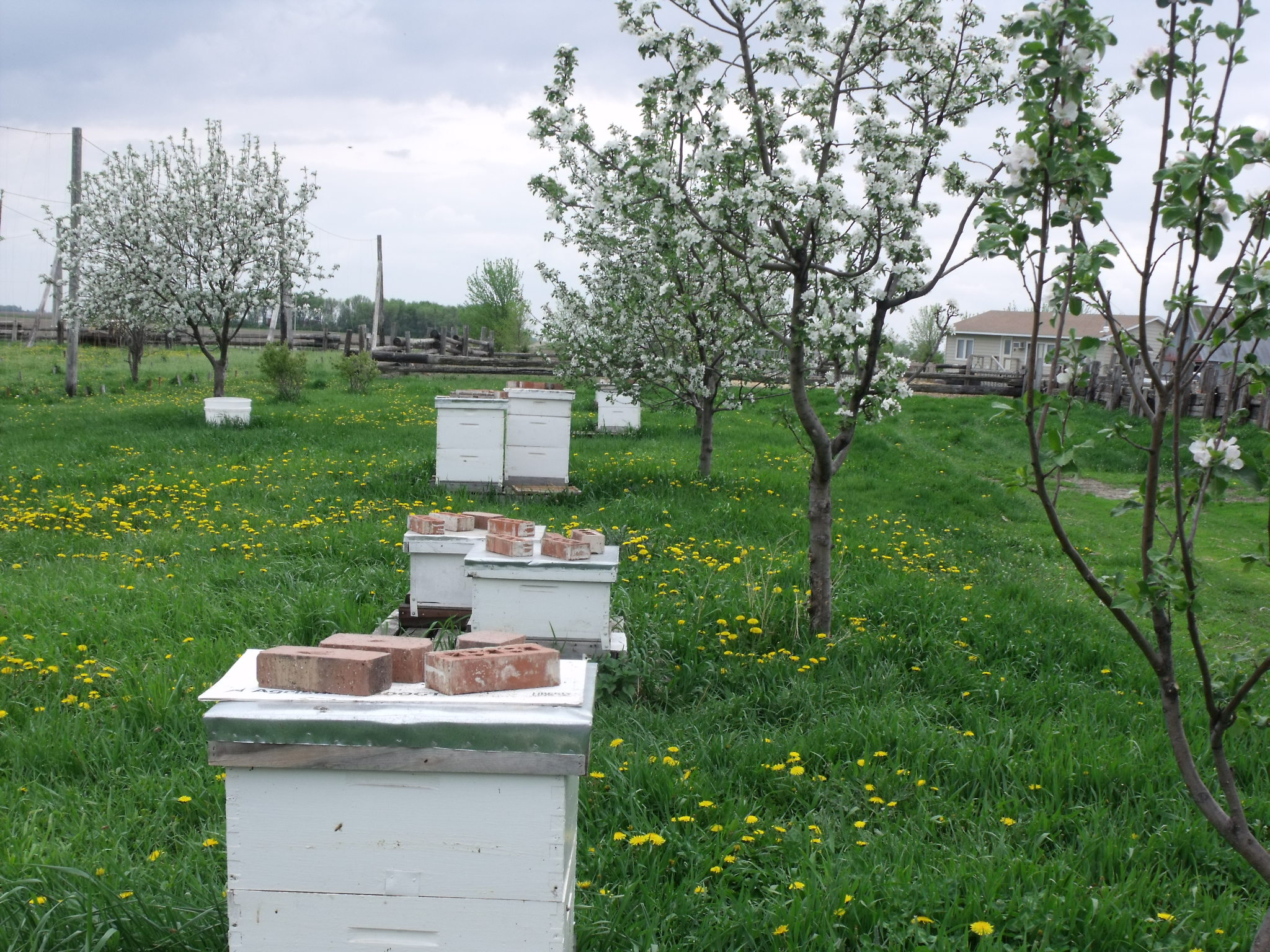 One set of our bee hives out near the hops yard with Peter and Frenchy’s place in background. More beautiful blossoms!