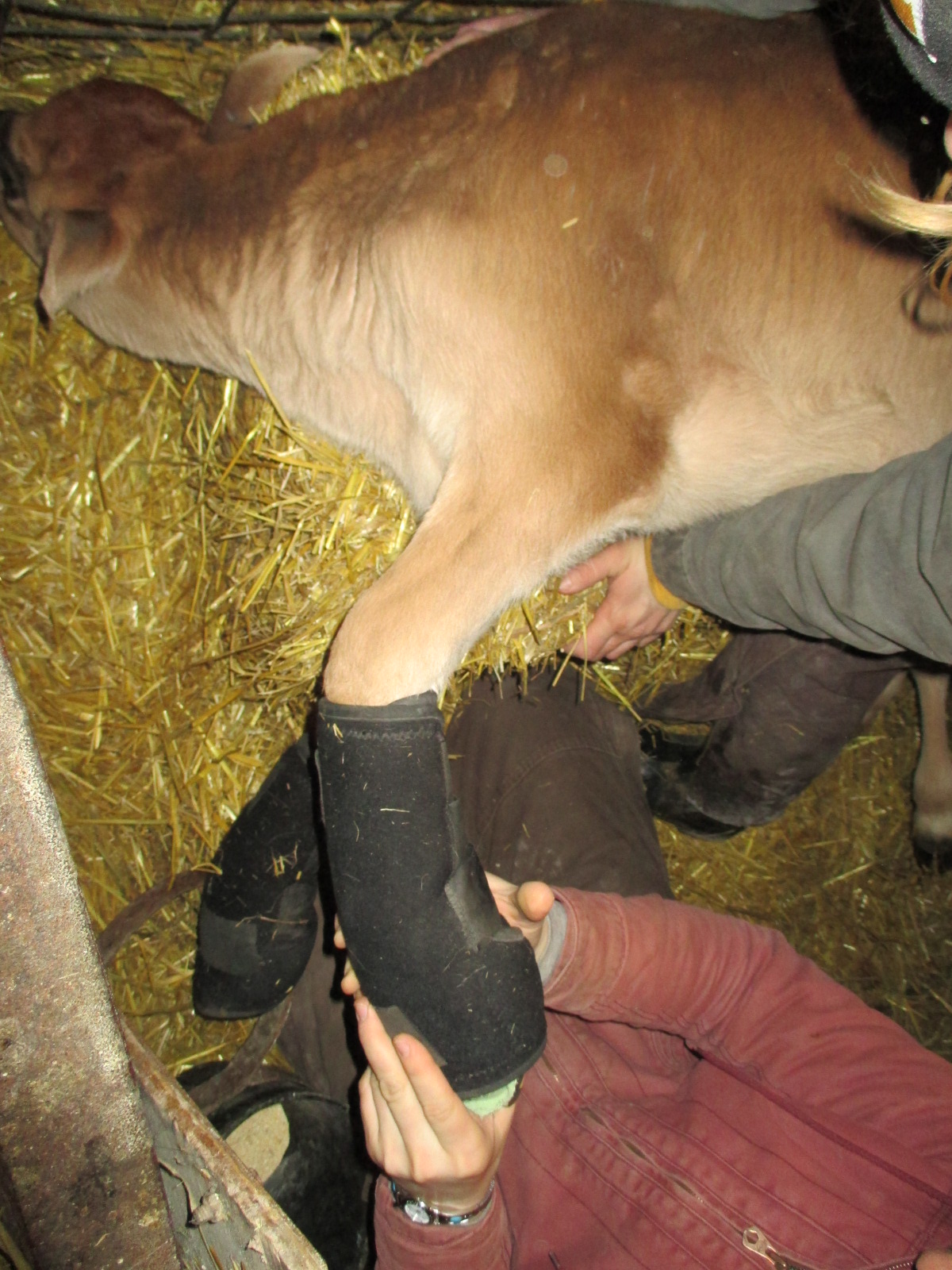 Now the little calf wears a pair of horse wraps. The girls tighten them every night. She is perfectly healthy other than the feet and yes she does walk.