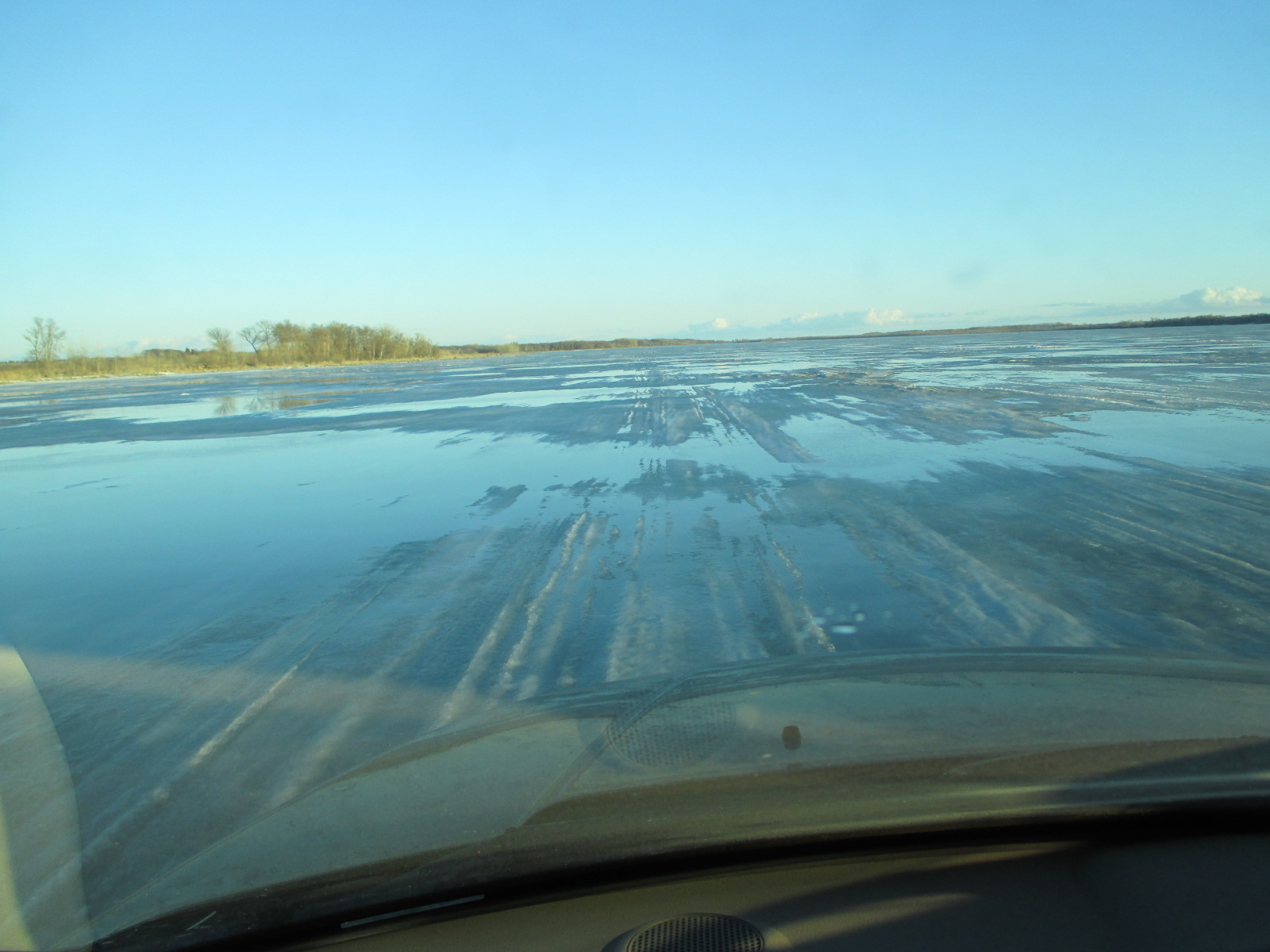 So what if the fish didn’t bite that day! It wasn’t for lack of effort on our part. This particular trip was made on March 8 of this year. I was pretty nervous driving on the lake as I followed our friends ahead of us out to what is normally a great fishing spot!! There was water on the lake and it was a lovely blue color. I kept looking over to see if Fred looked nervous and he kept giving me a teasing grin which was pretty reassuring. (NOT)