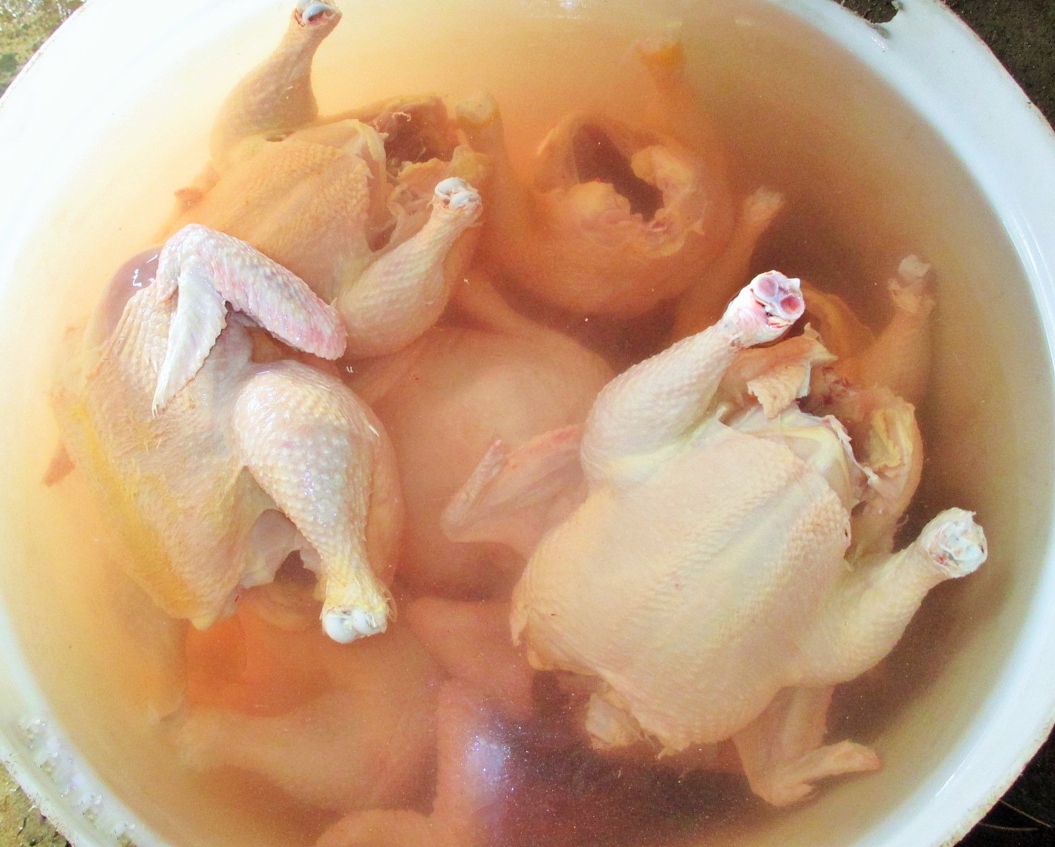 Fred built this chicken butchering hot water dipper from an old water heater and it worked great!  Marisa did the dipping.