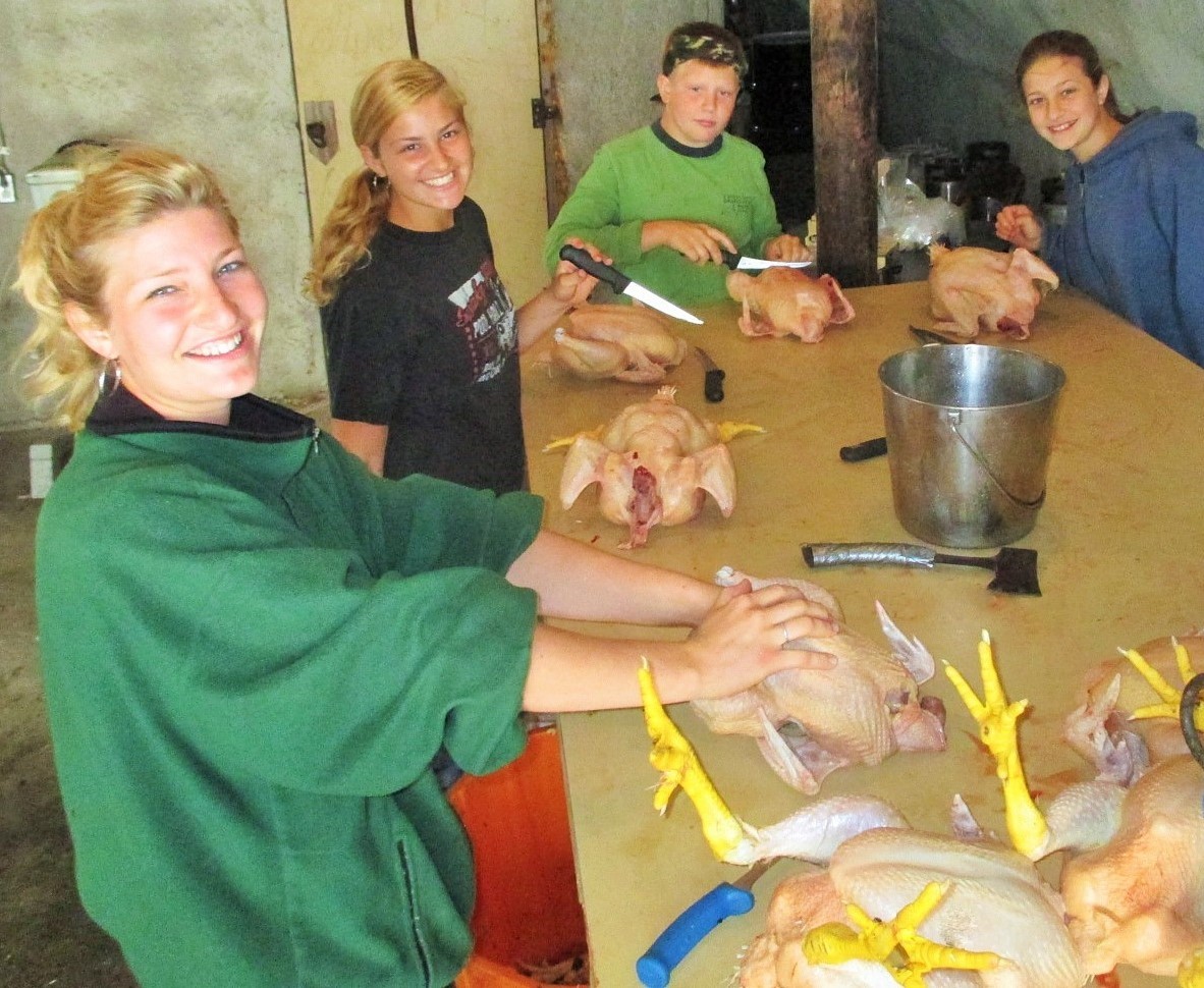The chickens are in the freezer…..all….73 meat birds, organically fed.  Thanks to our friends, The Fonders, for the organic feed.  The chickens also were out on grass in chicken tractors.  Processing was done on two different days, having selected  the larger birds first.  They averaged 6.4 pounds which is a good size for our family.  Maggie was in charge of the chores for these meat birds and she claims extra pieces at each meal due to her efforts!  She did a great job feeding them.  These chickens taste absolutely delicious.