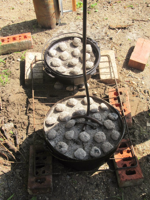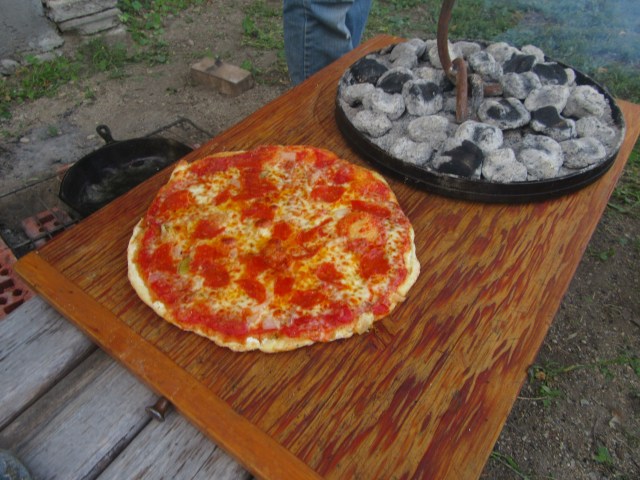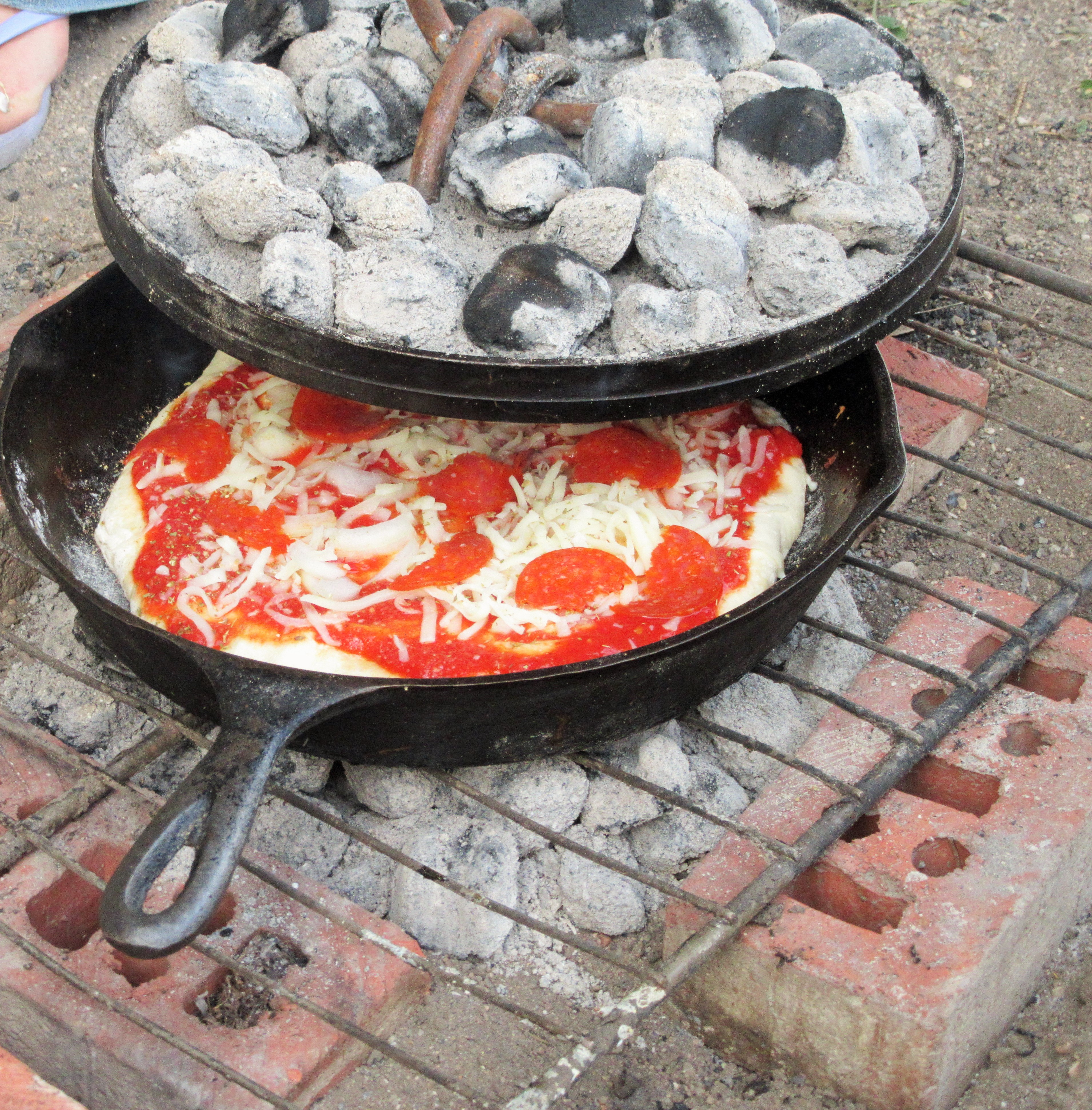 Low pan sides and plenty of coals on top brown the pizza to perfection. The bottom does not burn and each pizza takes around 12 minutes.  The first pizza is the slowest to cook.