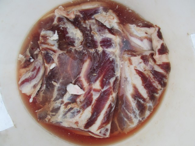 Barrel of bacon ready to be smoked.