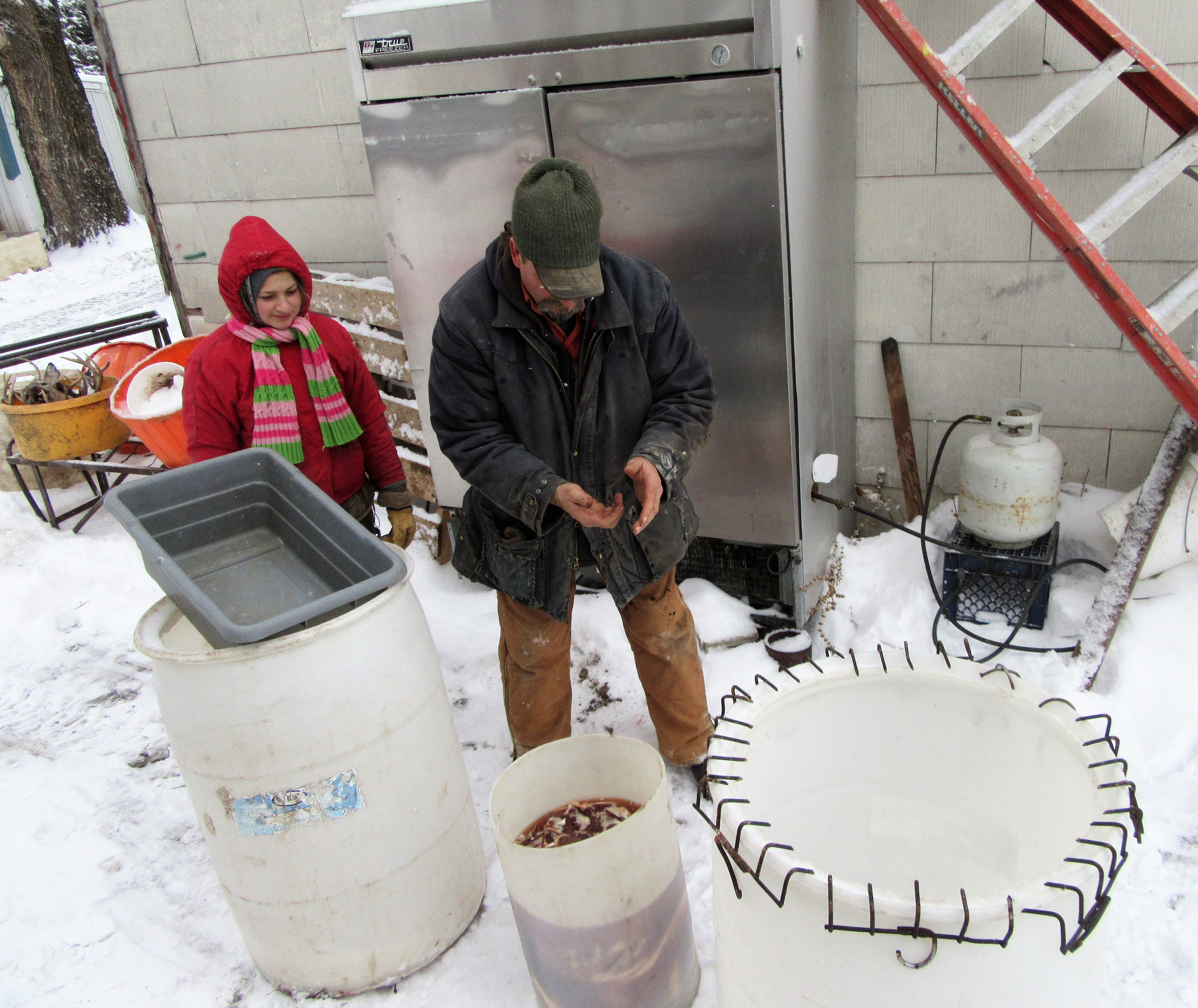 While livestock are fed and yards plowed, Fred and Bella prepare the bacon for smoking.