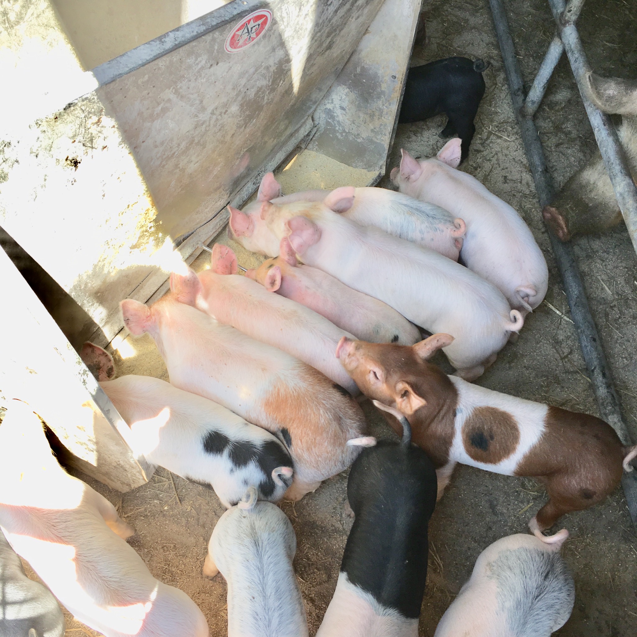 Piglets eating at the feeder station.
