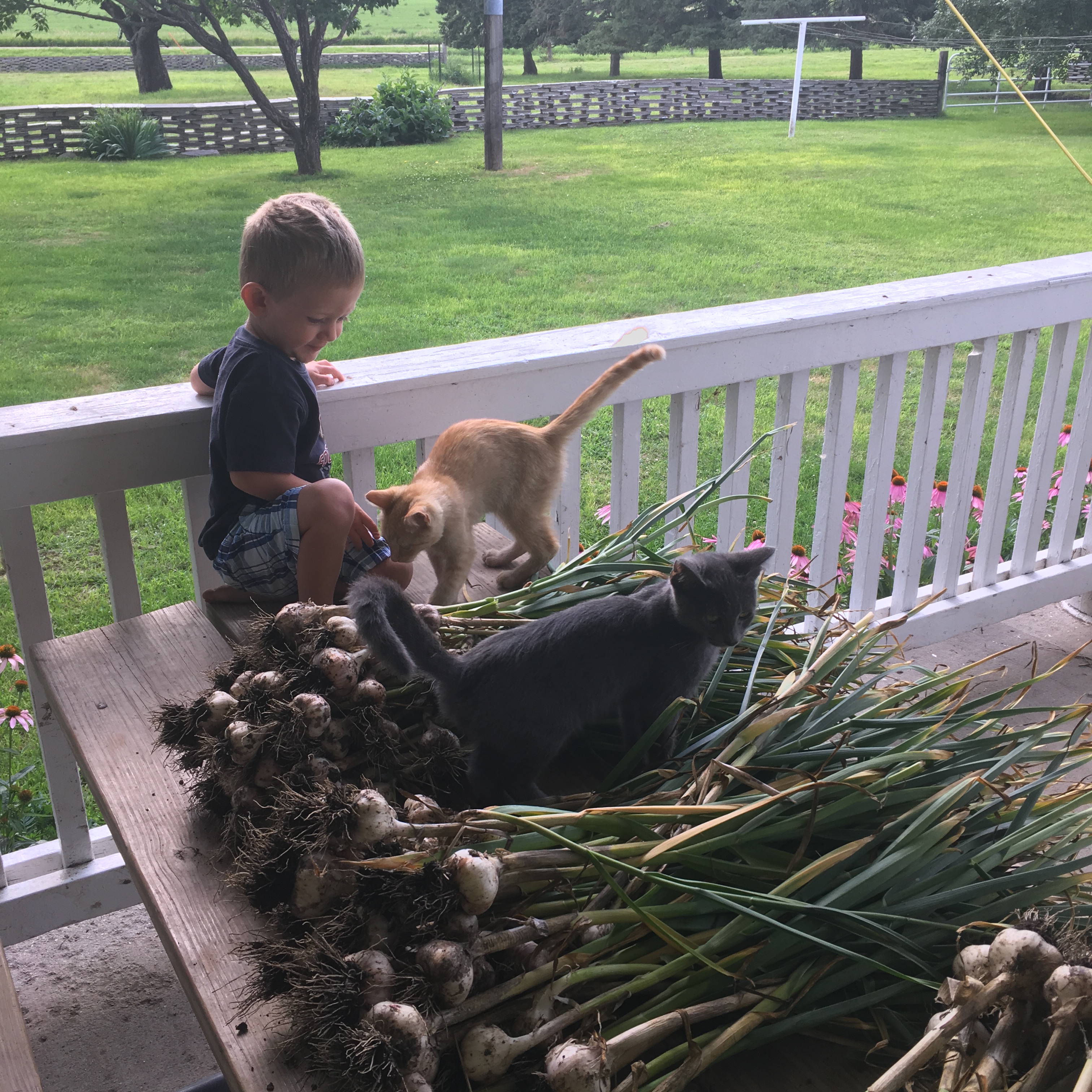 Love it when the grandchildren are around. Frenchy and Peters son, Rafe and the cats.