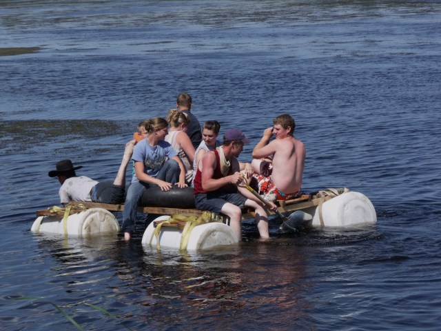 After a very long week with plenty of farm work, the kids were looking for some fun on Sunday (yes we do have fun on our farm) and since we can’t afford a boat , let alone a pontoon, the boys decided to build a raft. They wanted to build one strong enough to go down the Yellow Medicine River, but needed to test it out first on our local slough. After a bit of work and planning, around an hour or so, we were loaded up and ready for the test run. Would this funny looking raft hold us and if so, how many of us at one time? It did float and held 8 people and 1 dog, but could have had a few more riders. Several of us passed up the opportunity using the excuse that the babies needed watching.