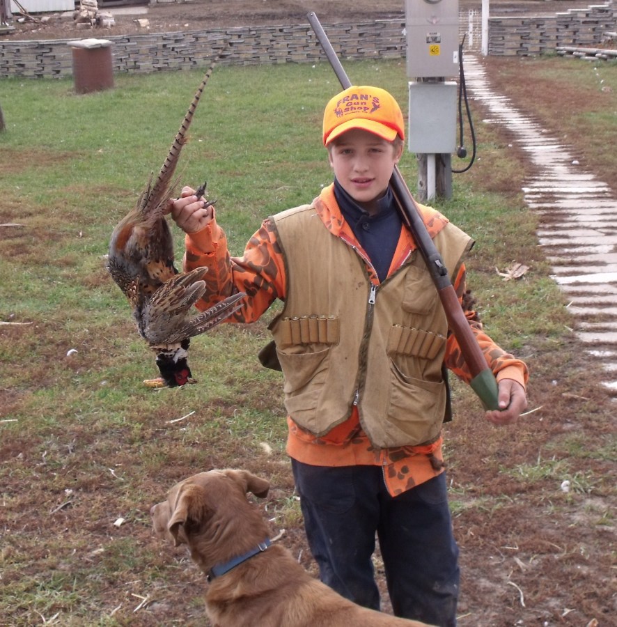 Caleb with a rooster pheasant that he and Rowdy brought down.