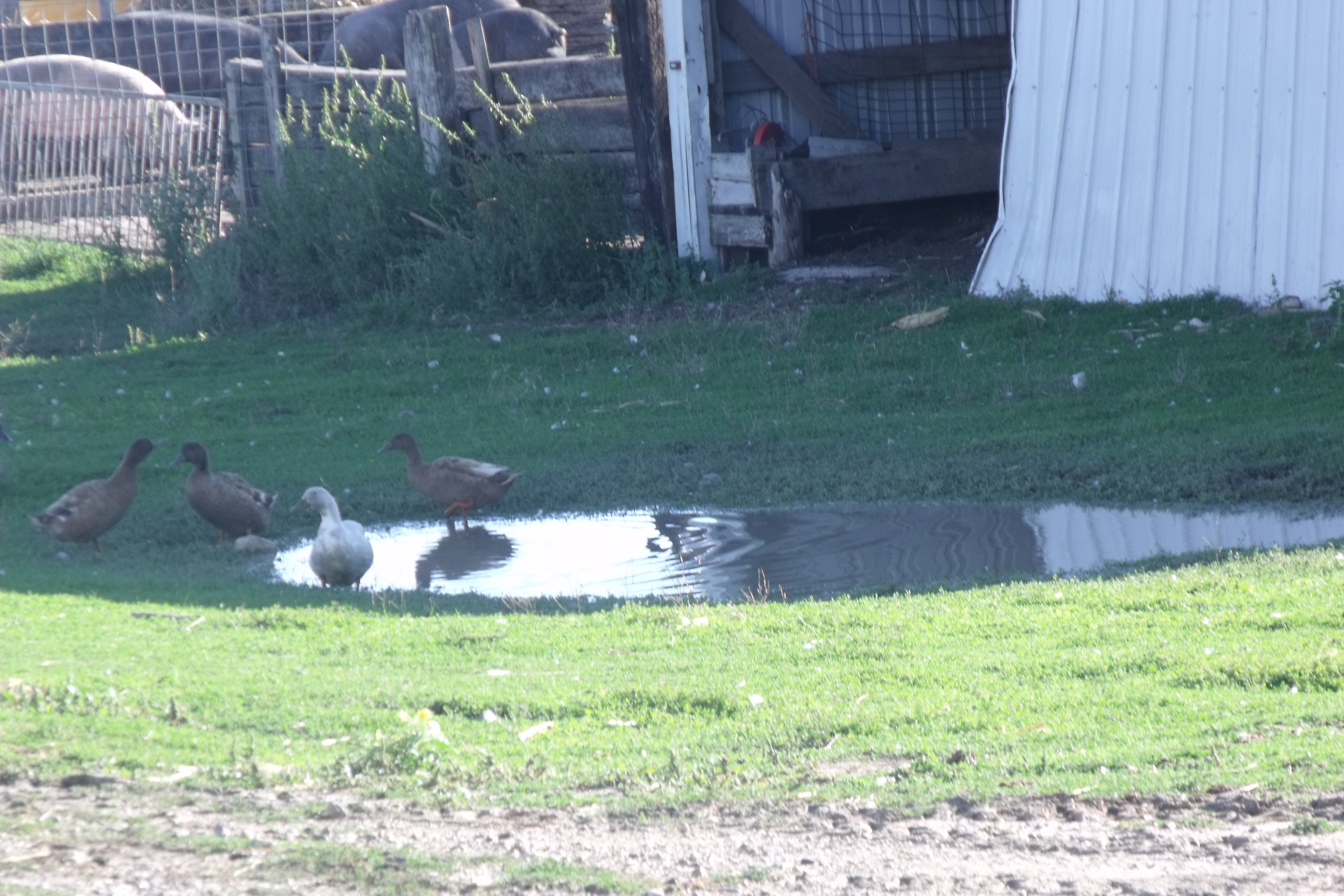 Khaki Campbell and Blue Swedish ducks go for a swim.