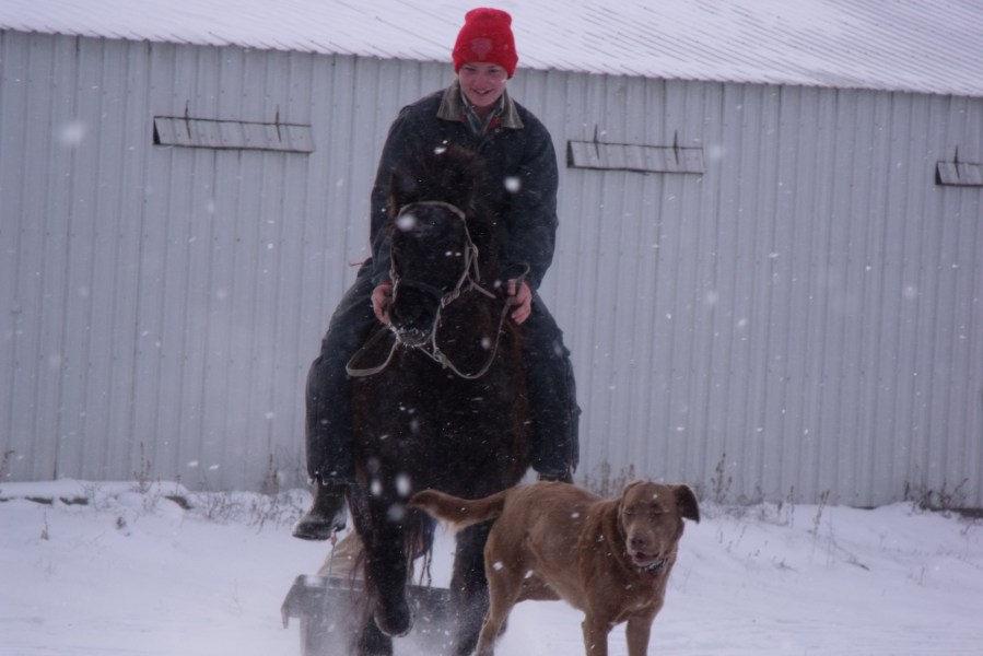 Silvana pulls Caleb in a sled with Star and Rowdy.